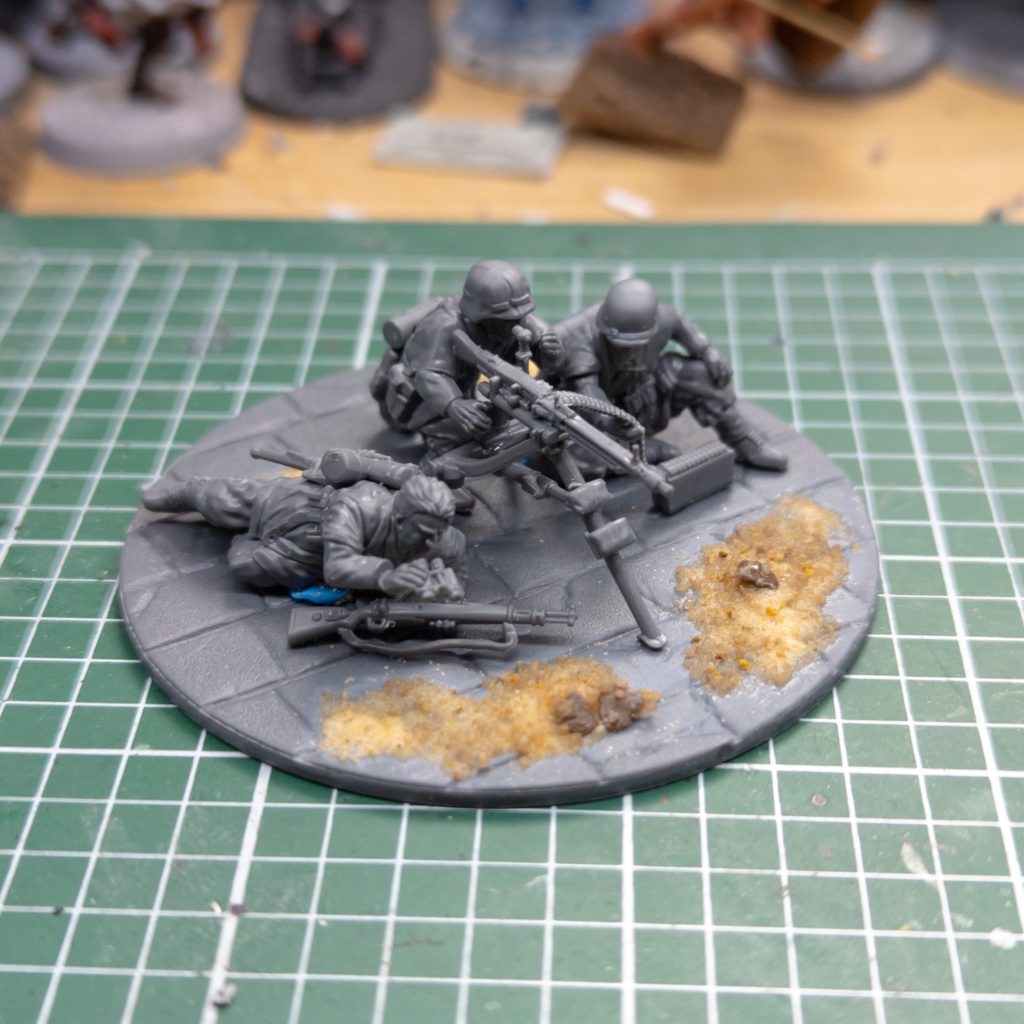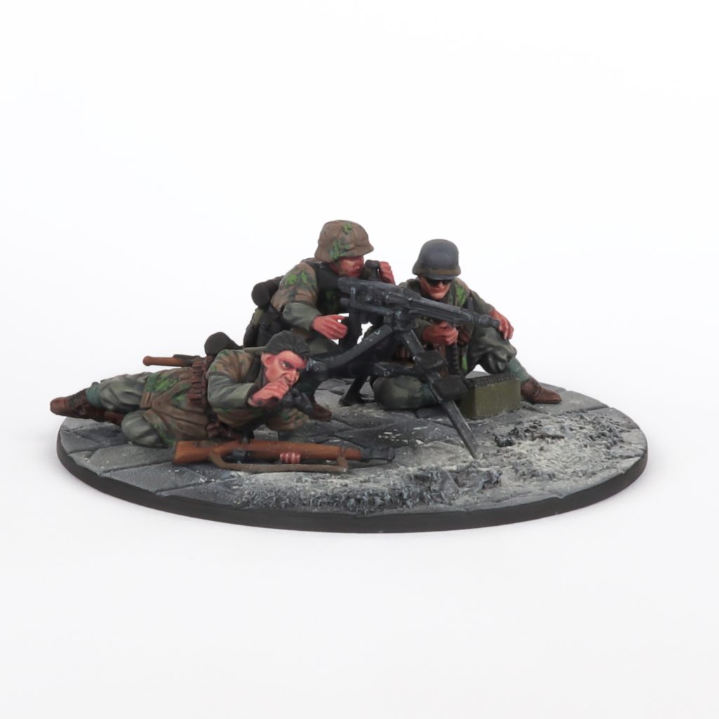 Now all that sounds amazing on paper, but one glaring issue that comes from this attempt to adapt very statuesque look is a lack of customizability. While they offer plenty variation for most sculpts that do not wear Zeltbahn, all who do have most of their body pre-sculpted, with only the forearms being separate pieces. This severely limits the articulation of arms and locks you into poses more so than the bodies that don't wear the ponchos. While not a death sentence, the historical wargaming hobby lives from kitbashing. Nothing in history was ever truly as uniform as some fascists would like you to believe. The lack of customizability is palpable and I think if you plan to build bigger platoons, you might get a little sick of how few choices beyond a head swap you have with these. Obviously people who have a lot of metal miniatures will not bat an eye since repeated poses are just a given, but this kit is plastic, a medium that allows for options and customization. Speaking of plastic miniatures; Another issue is the insistence on putty bases. I understand why they are convenient on metal miniatures; they create a bigger contact point for gluing (which is especially useful on running poses) and are useful for the casting process. But what purpose do they function on a plastic model? I know its not super hard to remove them, but I wonder why they were left out on the prone models and the MMG team? It just feels weirdly inconsistent and they could have just done away with them entirely in my opinion.