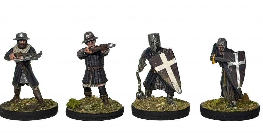 L to R: Wargames Atlantic Foot Serjeant, Victrix Medieval Crossbowman, Victrix Foot Knight, Footsore Military Order Knight on Foot