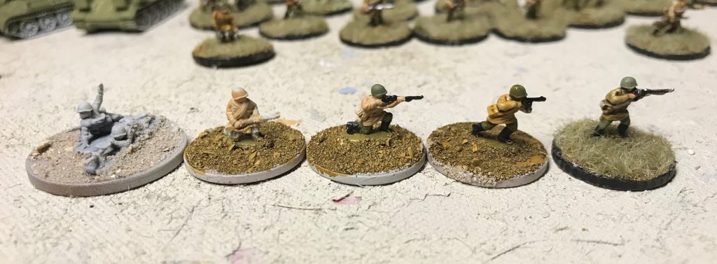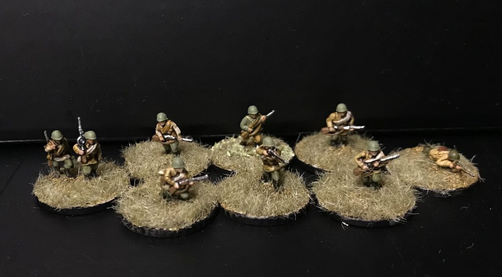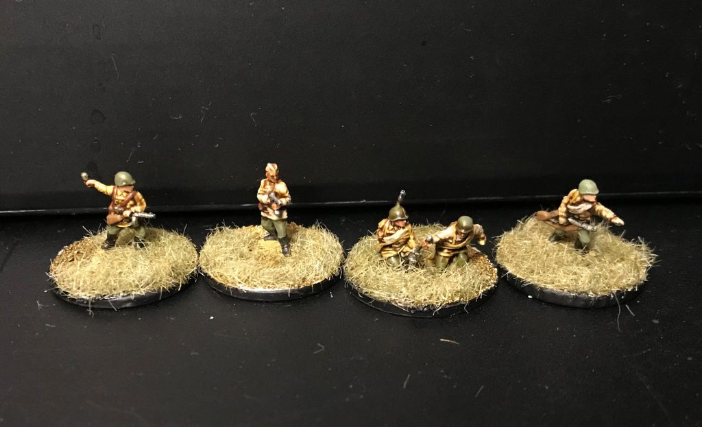I have painted these up in "classic" Summer uniform colours (with green trousers because I thought this looked fetching and for no other reason) - a light flesh base colour followed by a brown wash, and highlighting up from Vallejo Russian Uniform green for the helmets and trousers. Of course, this being the Red Army in WW2, there isn't really a single, definitive colour, so a variety of tans, browns and greens have been applied to different pieces of each model to give a strong visual theme but still add some variety.