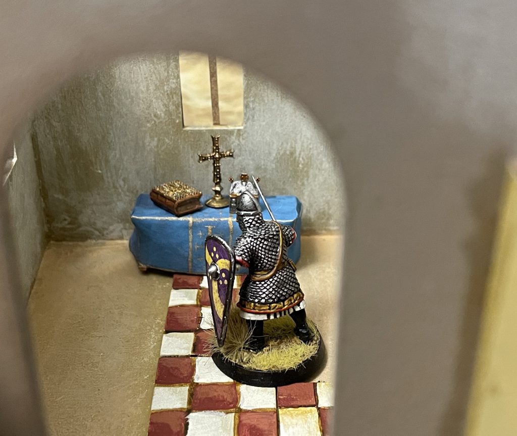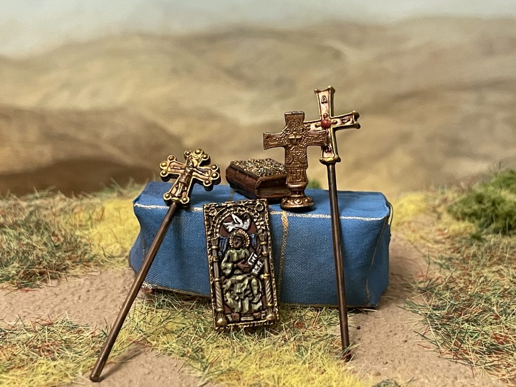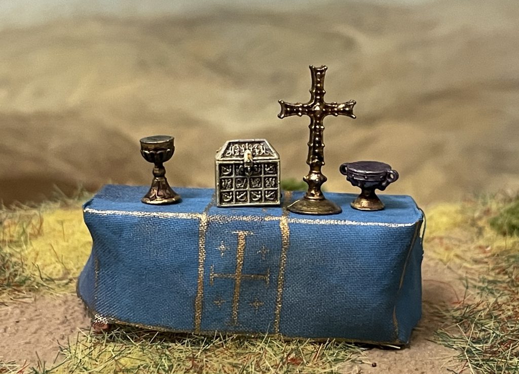 To display the set for photos, I combined it with a few tables from the Marketplace set, with a home made altar cloth (painted silk) to give a suitably grandiose setting for the religious pieces!