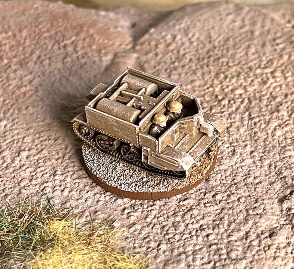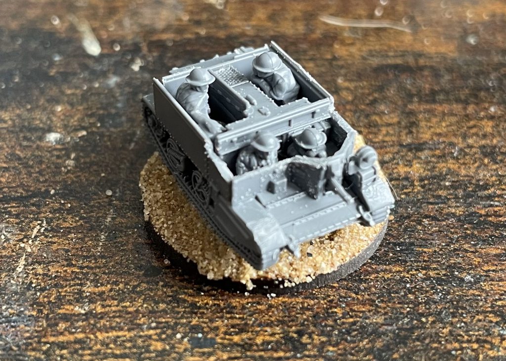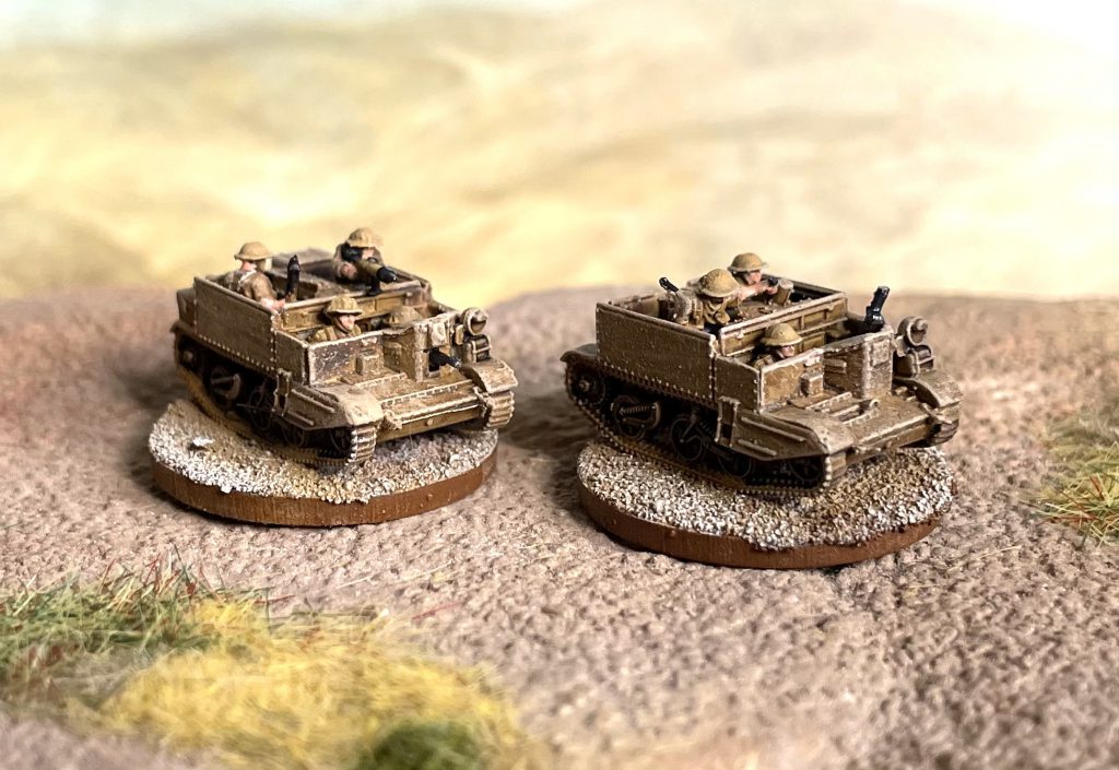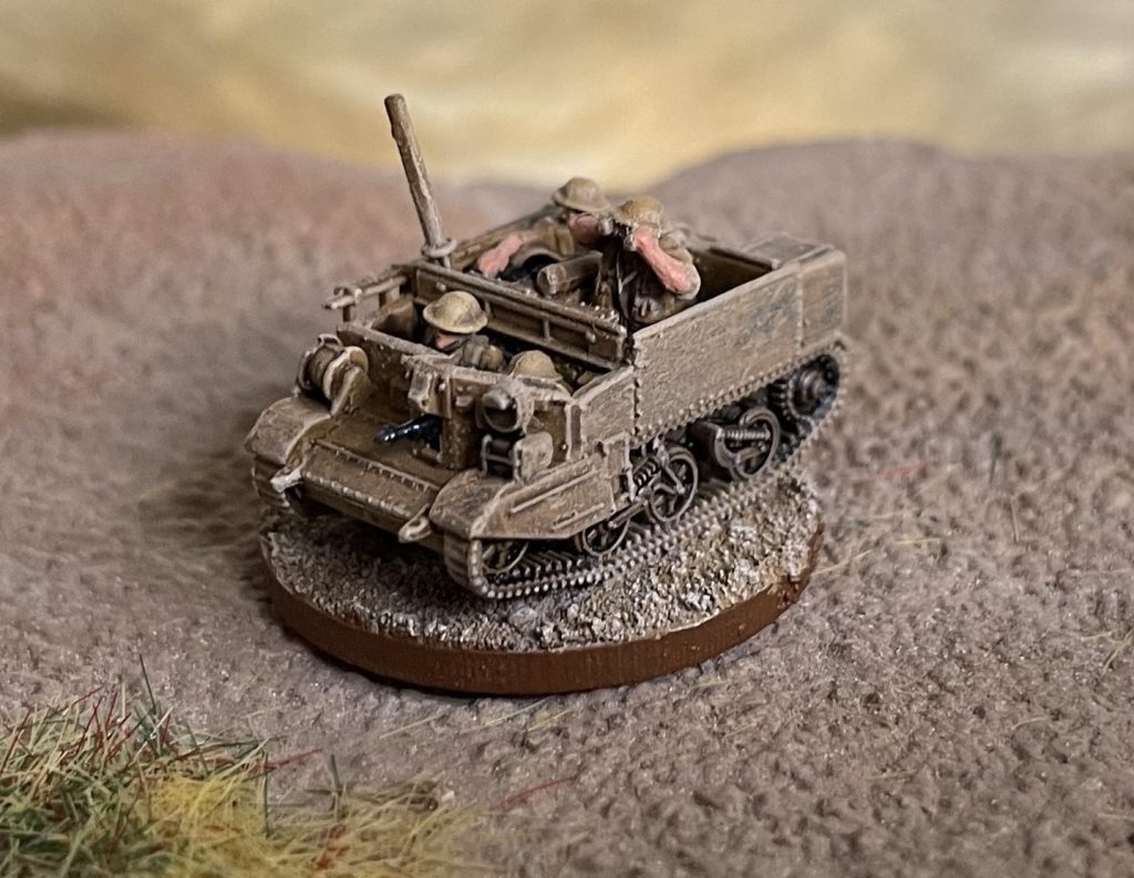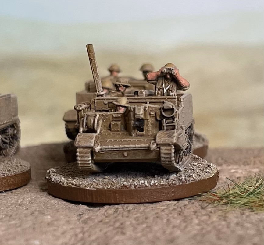 This means you can buy a bag and put together a Carrier Section (two, and three in the late war, bags would get you an entire Carrier Platoon) accurately according to any TOE you can find online. You can fit the full complement of crew/passengers in each Carrier, and if you wanted to be incredibly clever you could leave crew unglued, letting you switch from early war 3 man to late war, 4 man, teams. Of course, in researching this, I found about fifty variants of the Carrier Platoon/Section, but most of them stabilise around three carriers - one transport, one 2 inch Mortar and one anti-tank. I built mine to this, added a command tank and couldn't resist adding a flamethrower carrier.