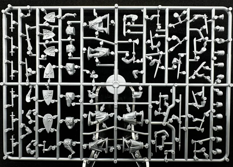 Each kit contains 24 knights on four sprues of six. The knights are multipart, in five main components - legs, torso, heads and arms. Two bodies on each sprue are armless, giving you the option of going sword/axe/mace and shield or two-handed weapon. One torso is clearly the hero pose of the kit, with an arm flung out with shield behind, but the rest are quite neutrally posed. Everything is in period-appropriate surcoat and mail (no plate armour here!) for the 1150-1320 range the kit covers.