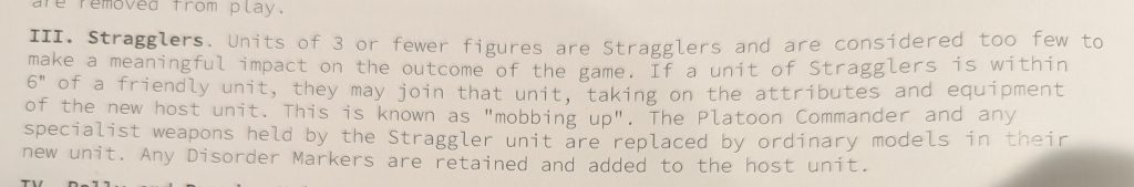 Several questions arise, though, from the wording here. Can ANY unit of three or less models mob up into a friendly unit, including officers and support units? What about units that start with three or less models at the beginning of the game? If a unit is reduced to three or less models by taking casualties, and no friendly units are within 6”, are they removed from the table? It is somewhat implied in the first line, but not explicitly stated to be so. The result is that the player must attempt to intuit the author’s intention here, and in a few other places. A short FAQ / Errata would likely help to shed light on these interactions.