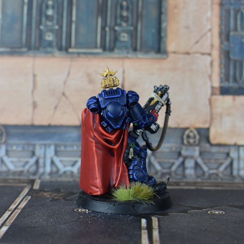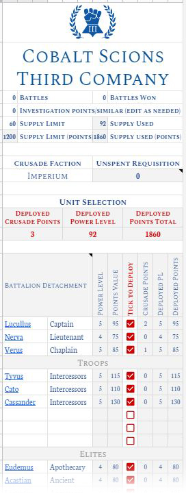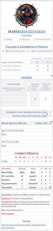 This grumpy old boy is the fifth and final member of my Primaris command squad, and I'm happy with the results for the time I put in (about 9 hours). With him done, the initial Cobalt Scions force is finished. Woo! Eighteen months of slow but satisfying progress. I covered the paint recipes over on the Beard Bunker, along with his lore (how's a Primaris marine this old?). With the essentials on the battalion complete, I got them crusade-ready by filling out the Automated Crusade Roster I designed. I've used the version of the unit card that has space for each unit's rules, like so: