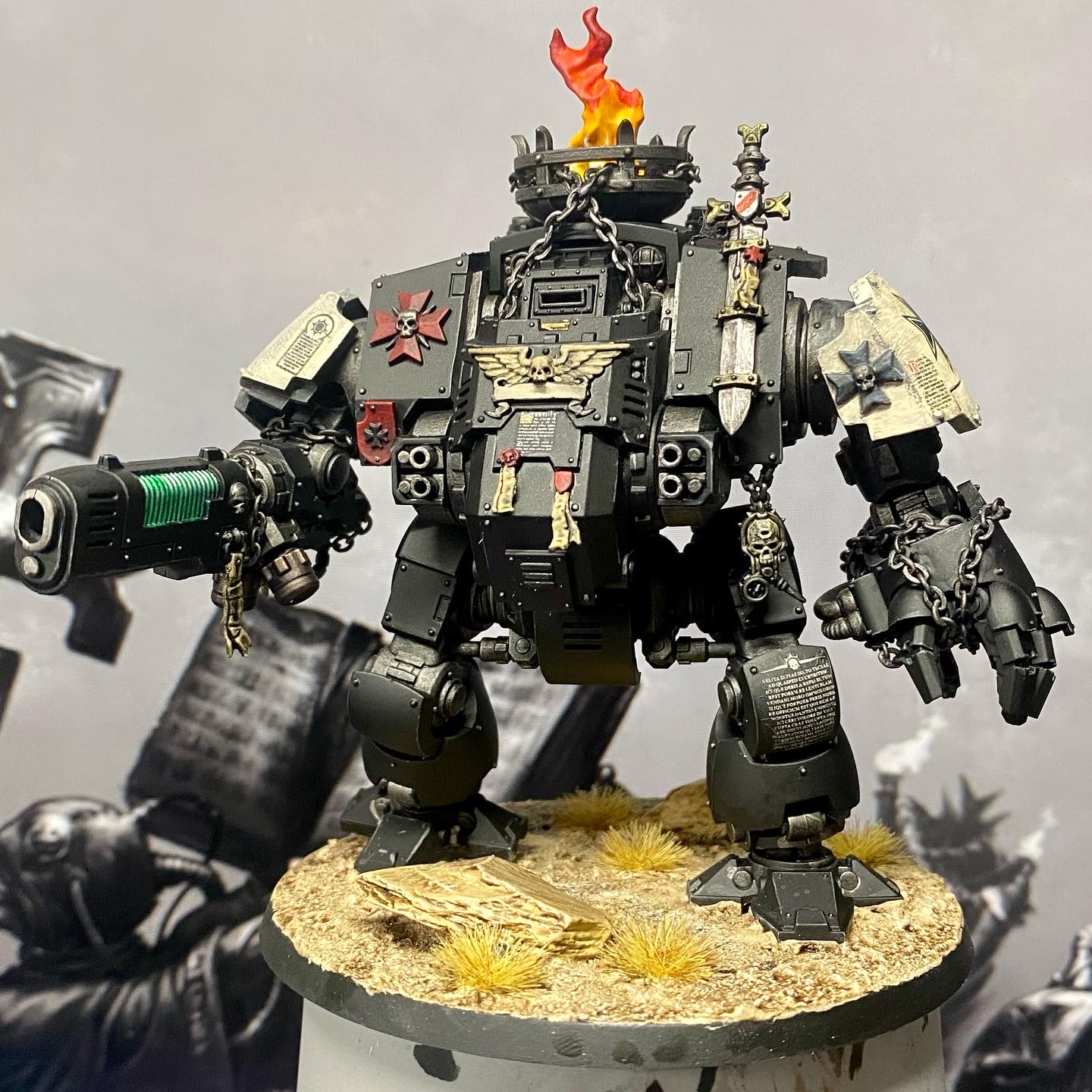 The Dreadnought is sporting a brazier from an Age of Sigmar terrain kit that's been cut down to size and chained on along with a lot of bits from the Templar upgrade sprue and transfers from The Mighty Brush for all of the text.