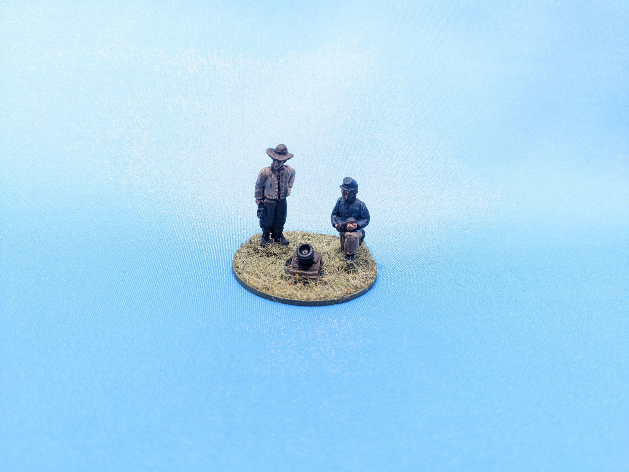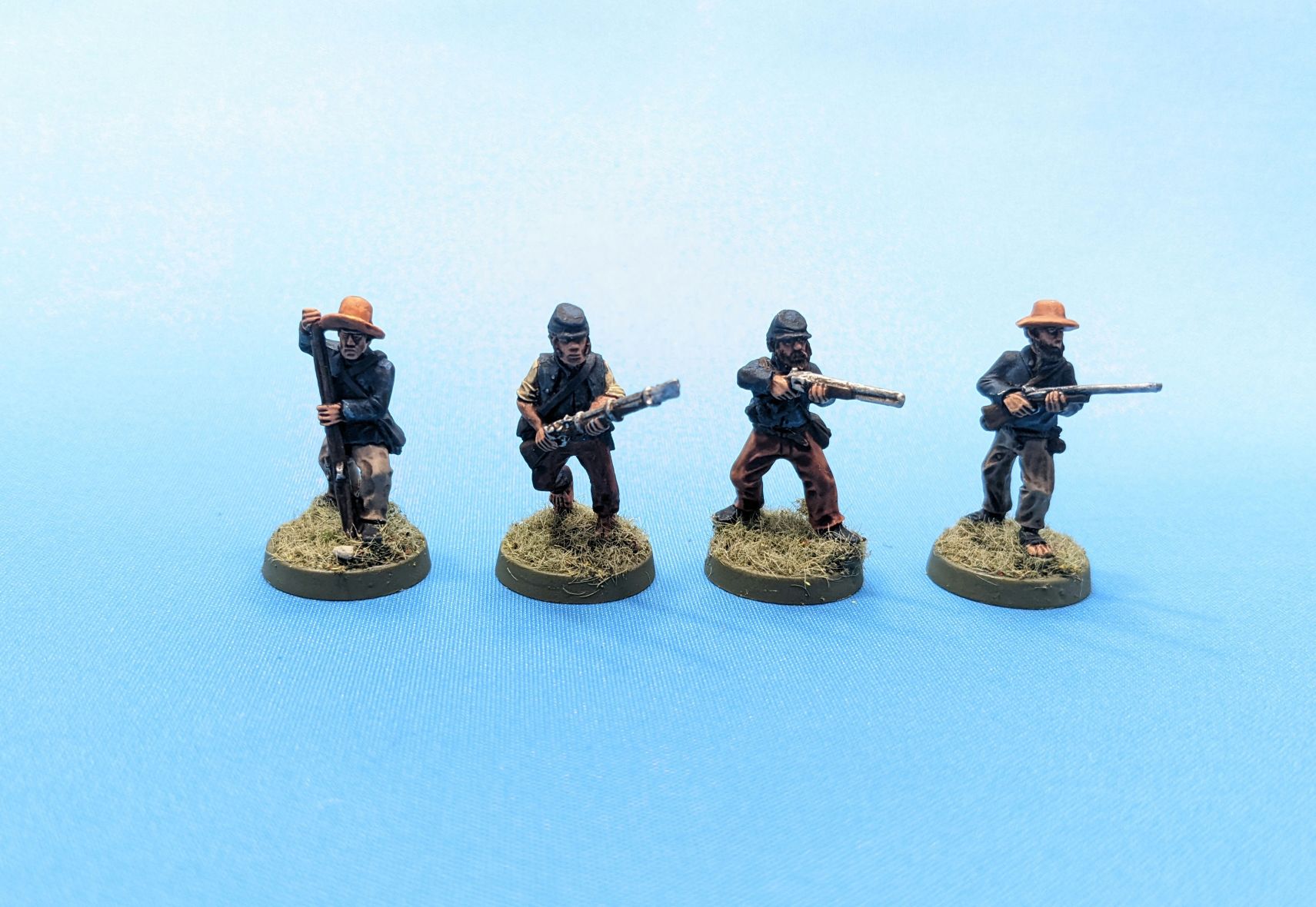 These are some bushwhackers from Crusader Miniatures, one of their more recent ACW releases. Love the poses, love that one guy is using a flintlock and one guy a double barreled shotgun.