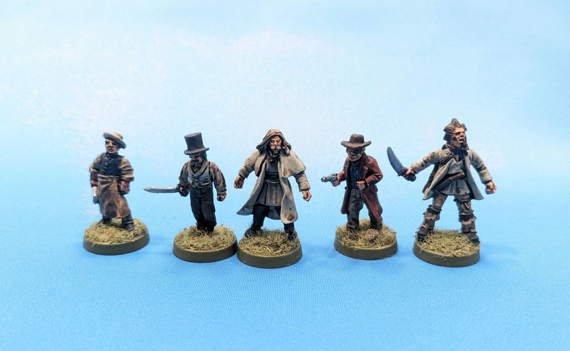The guy on the left is a civilian from Knuckleduster, I believe. The second from left guy is from the Perry Miniatures Bread Riot set, also known as Bill the Butcher. The middle and far right guys I believe are from Dracula's America by North Star - but I can't find them on their site. The brown coated gentleman is form the bushwhackers set above - pretty sure it's John Wayne as Rooster Cogburn. He'll make a good town sheriff.