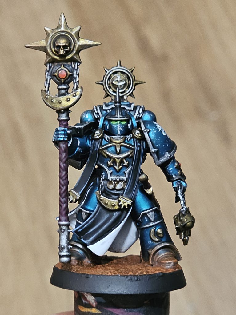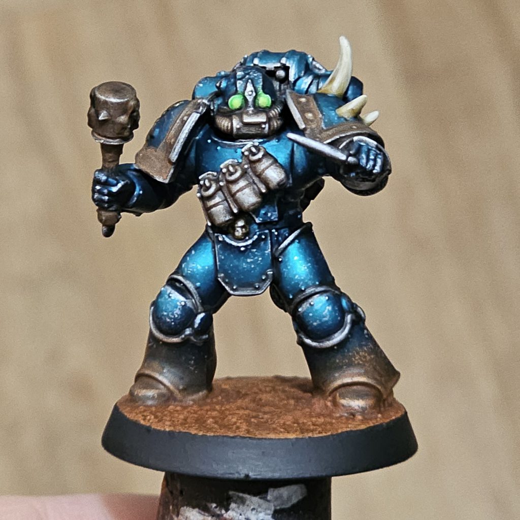 Pequod is a grafted cow's vertebrae, grafted together with green stuff, and lil' plastic hemispheres from hobbycraft for eyes. He is going to use his melta lance and ursus claws to kill warlords, like how Melville's Pequod hunts whales I guess? I just wanted a chad with a harpoon.