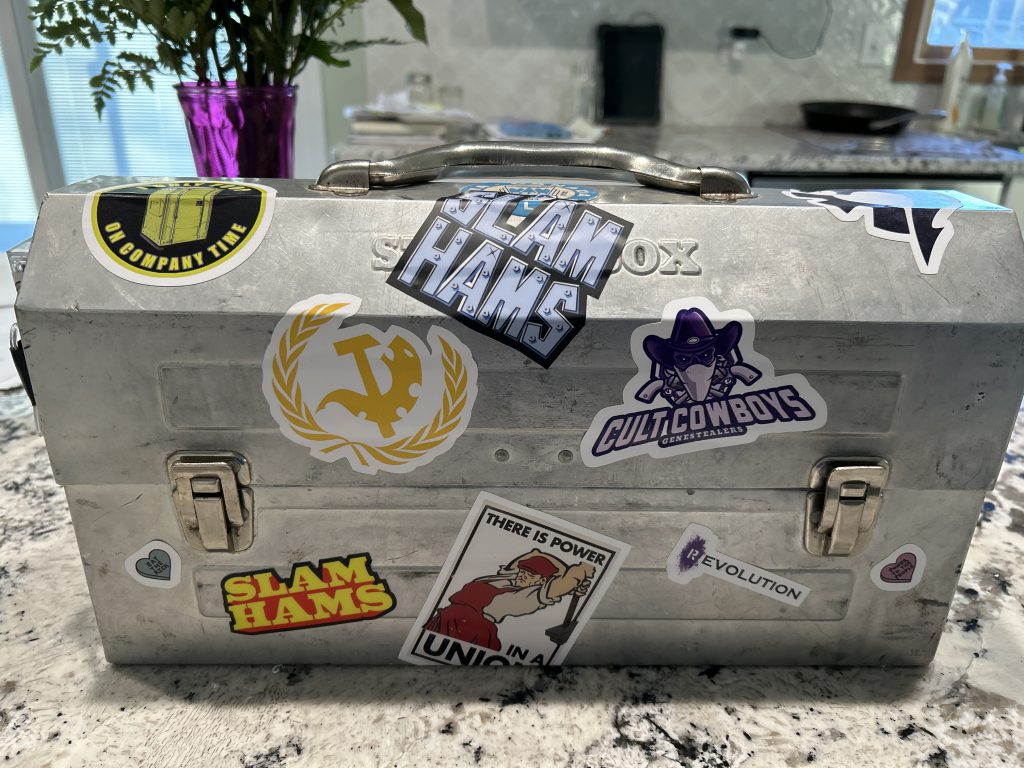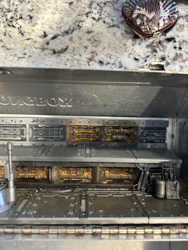 The idea to use an old Union Lunchbox as a sort of base of operations for my Genestealer Cult had been swimming around in my head ever since I started them for Necromunda and I finally took steps to complete this project. This was performed by a considerable amount of sawing, cut, and filing of the Necromunda base tiles and walls. I did my best to measure out the dimensions of the box that you see and planned out what sections I wanted to glue together and paint, repeatedly doing dry fits to see how things would go. Nothing really fit perfectly but once I had a 99% solution I sprayed and painted everything up using a combination of the