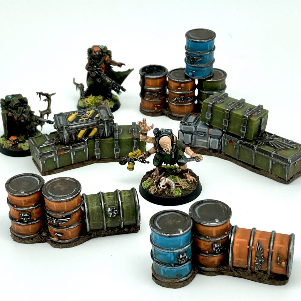 Barrels and ammunition container barricades, often played with narrative rules for exploding when shot. Credit: BuffaloChicken