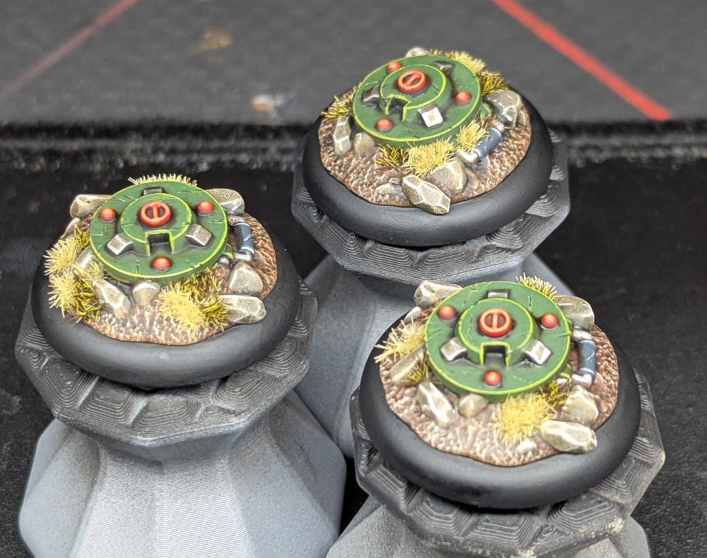 My other main interest this month has been Warmachine! I've always been into the game locally, but have shied away from the printed MkIV miniatures. The recent Cygnar Gravediggers release put paid to that though, I couldn't resist. I'm pleased to report that the prints are mostly very nice, and much stronger than I had hoped. To get my eye in I painted some landmines, which are tokens placed down by the Warcaster, Buck Hasker.