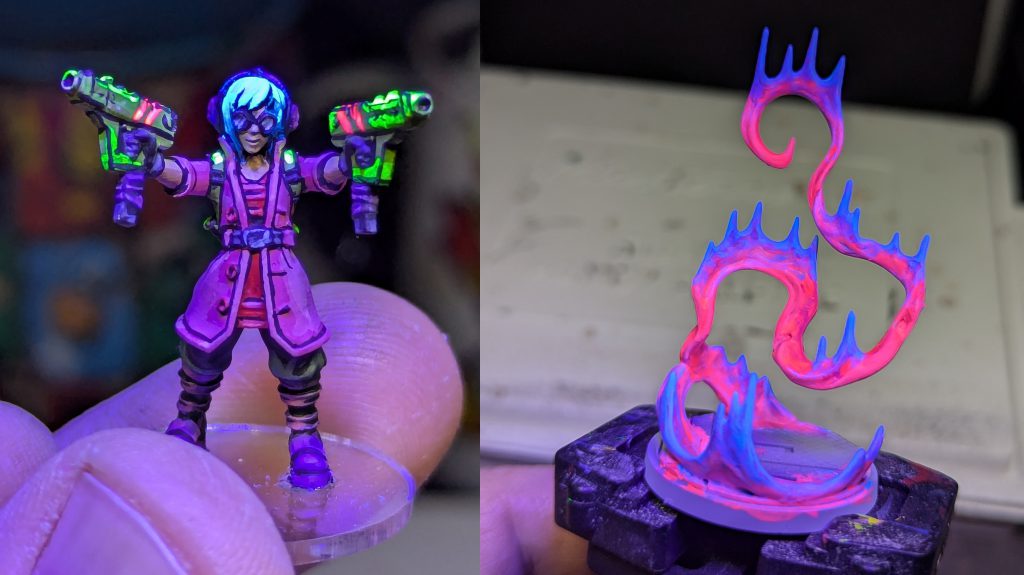 This was cool, but I wanted more and felt that the flames needed to be shiny too. So I did some more tests with that and found something that I'm really happy with. More on that later. But in the mean time I wanted to try them out with a mix of regular paint and other fluorescent paints. So I started working on Supergiant and began painting her spell effect in pinks and blues. I was having a hard time seeing what I was working on though, and opted to buy a black light desk lamp for my hobby space. Now I can see what's happening as I do things, while still having my normal lamps on as well.