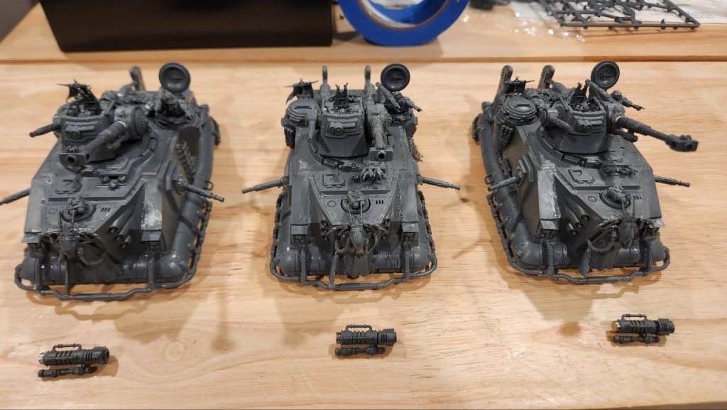 Bit of some small potatoes for this month, but I finally got a trio of Skorpius Disintegrators ready for priming & painting, with magnetized guns. This is the first time I've magnetized a weapon swap in ages, but given the propensity for either choice to be meta at a given time I thought this was a good time to get back on the saddle for that. I'm especially happy with the spotter pointing out of these, as it's much harder to forget the tank has a missile launcher when there's a poor sap holding an RPG peeking out of the hatch.
