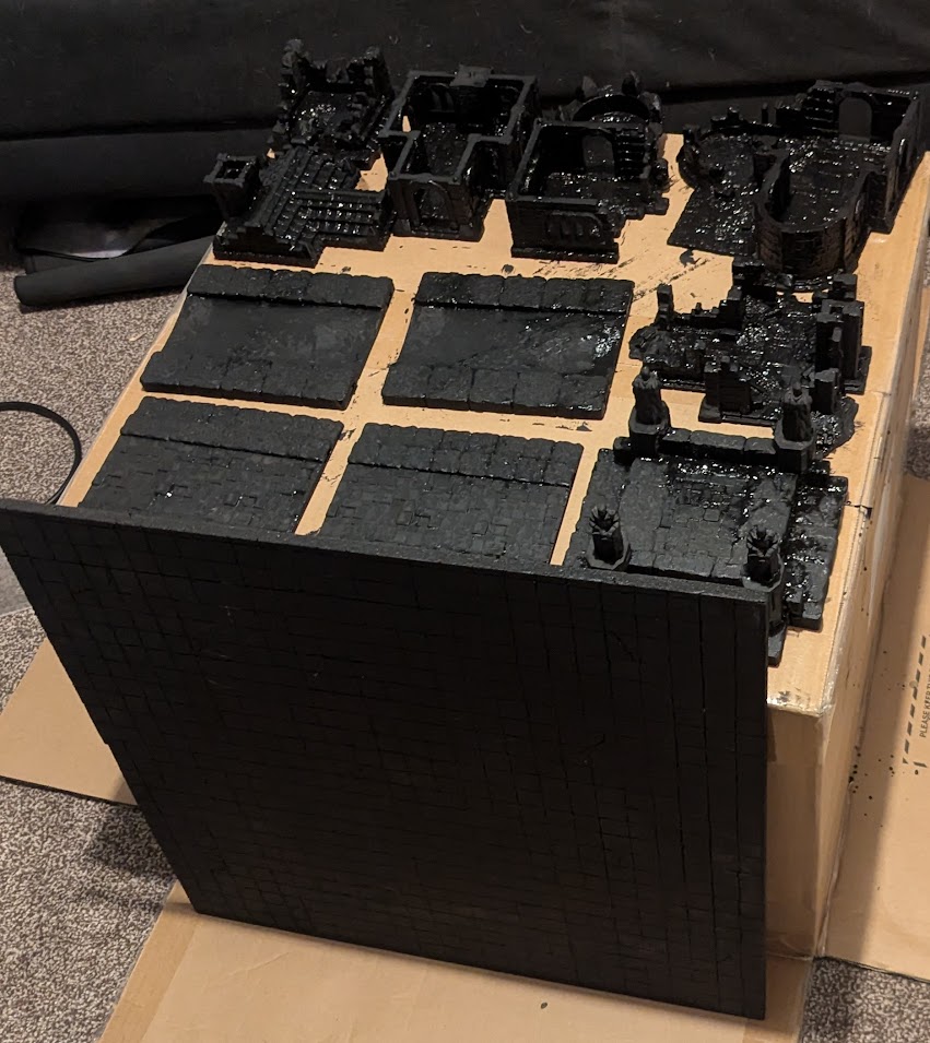 This project was perfectly timed with receiving the files from Conquest Creations' recent Kingdom of Tor Ithilas Kickstarter, which I backed a couple of months ago. I printed off some roads, rivers, and a bridge, then set about making a board for them. As it didn't need to travel far the board is just 6mm insulation foam, with a tile pattern scribed into it and then painted with a big brush and black edges. The terrain itself got a Colour Forge Ghoul Grey spray, then a variety of washes and unifying drybrushes for that Osigiliath stone colour. The river got a wet blend from blue through to black, then a quick layer of Ardcoat gloss varnish. Not fancy resin work, but it would do.