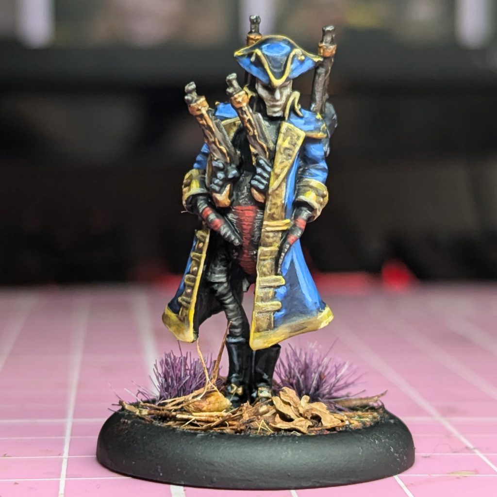 Mostly I am saving these for a spooky Hallowe'en painting project, given their theming, but I couldn't resist painting Lord Longfellow. This guy is a full on spider masquerading as a human duellist, and such a cool model. I chose to paint him blue with gold trim so that he almost looks like he's disguised himself as one of Cygnar's Arcane Tempest Gun-Mages.