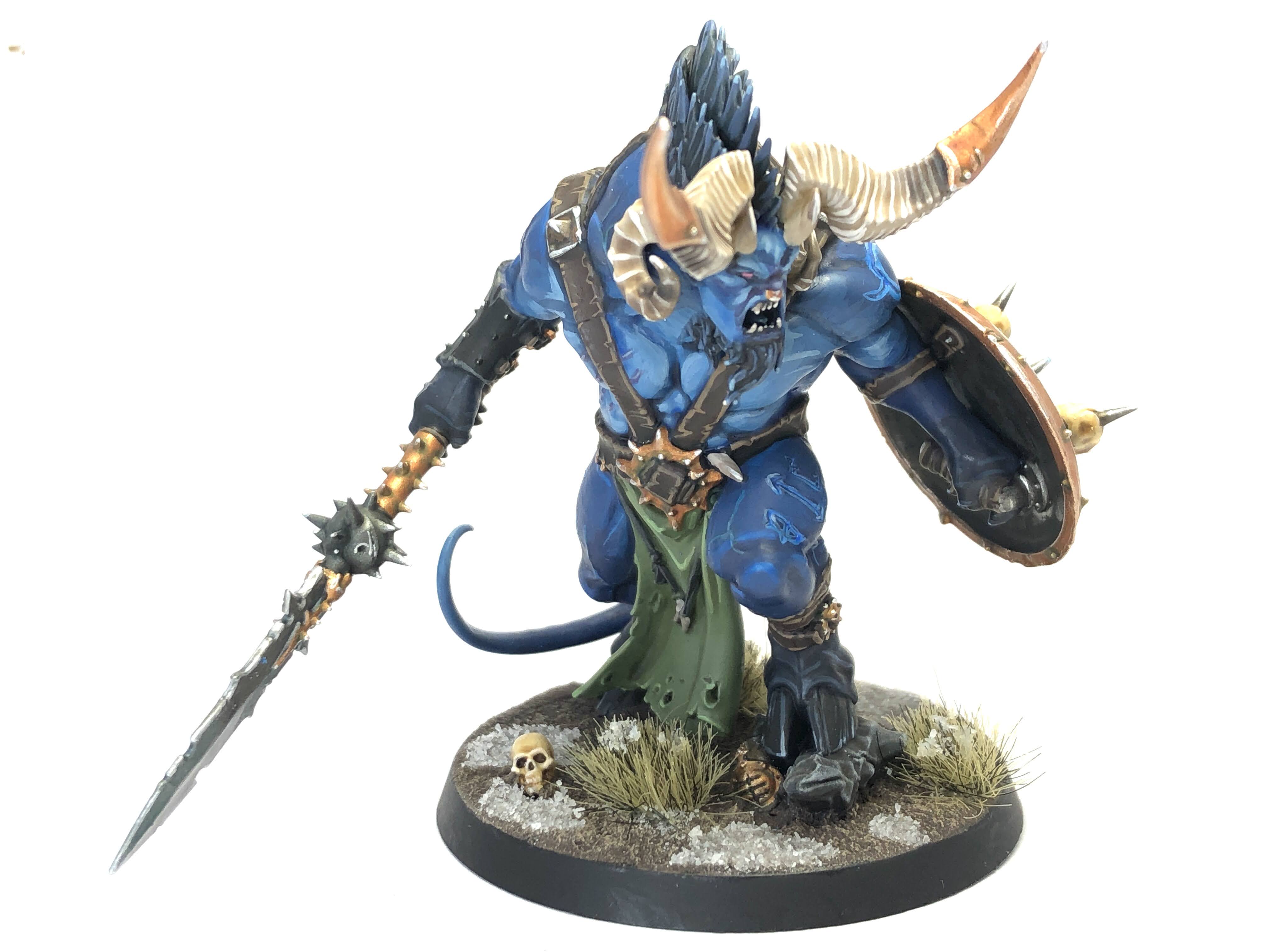 The Blue Meanie here was going to be a Daemon Prince conversion, but I just couldn't make any wings work on him. I still got to use him as a counts-as Daemon Prince in an AoS game though, and he fit in nicely. I learned a ton about painting skin with this big guy. I can get away with more traditional line highlights on smaller models, but on muscles this big they just look unnatural. My buddy
