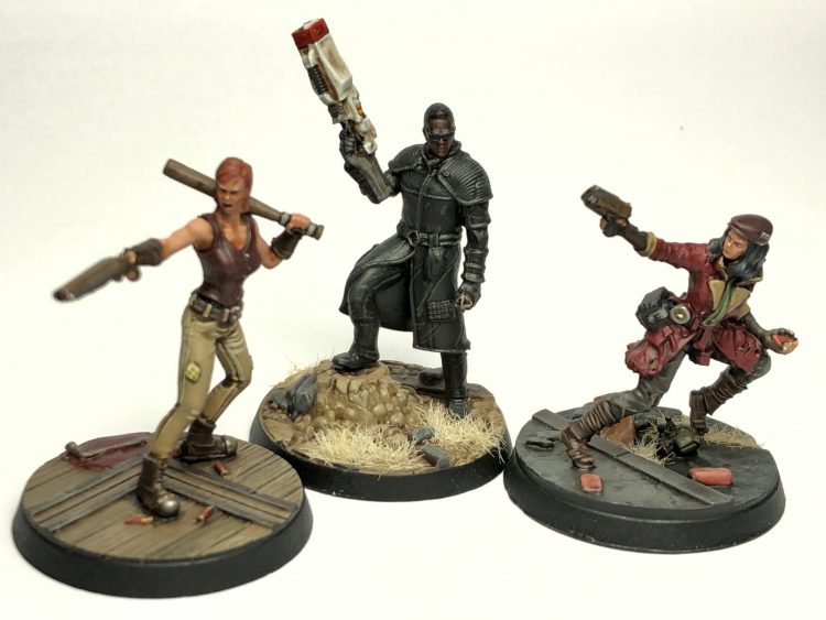 I had a fair bit of fun with this trio, as they really are a distinct set of characters who don't share many aesthetic elements. I made most of the metals similarly rusty on Cait and Piper to tie them together, but X6-88 shares basing and not much else with my other Fallout minis. He painted up mad quick though, especially compared to Cait and Piper, who involved some custom color mixing for the corset and newsboy cap, respectively.