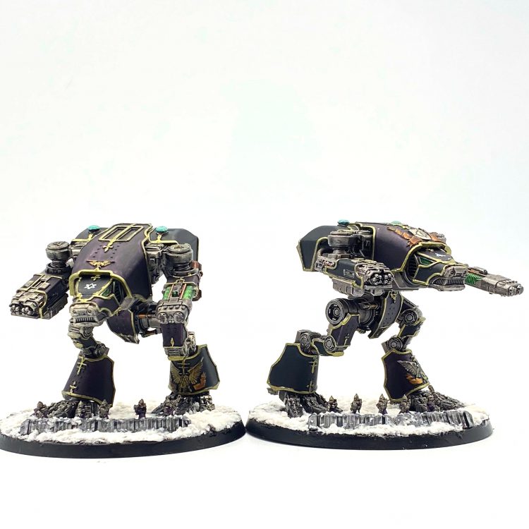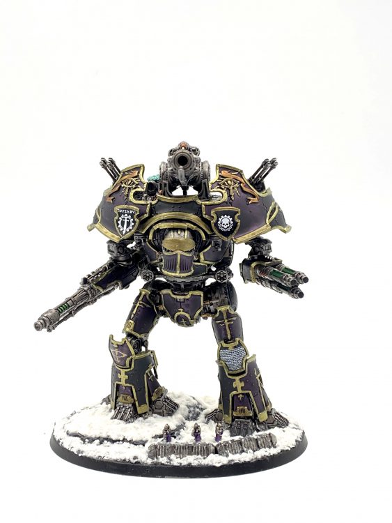 FINALLY I got some painting done. I started a second (third, kinda) Legio for Titanicus that I've been wanting to do for a while, Mordaxis! Started with the Warbringer that was going to be in Vulcanum colours originally but was just really feeling the purple. So then I did 2 Warhounds along with it and am now working on 2 more Warhounds and a Warlord, and a bunch of Knights....I'm matching basing with my Vulcanum engines so I can share the Knights between them, and it also matches my artic themed mat for home games. Also added some Vanguard Minatures pieces to the bases along with Forgeworld Titanicus terrain to help give sense of a larger conflict that the Titans are part of, and to show their massive size in a tiny scale!