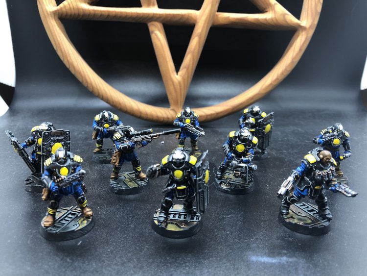 I painted some Necromunda cops. This is bad, because they're cops, but it's also good, because a lot of them are going to get shot and set on fire. The one with two shields is my favorite.