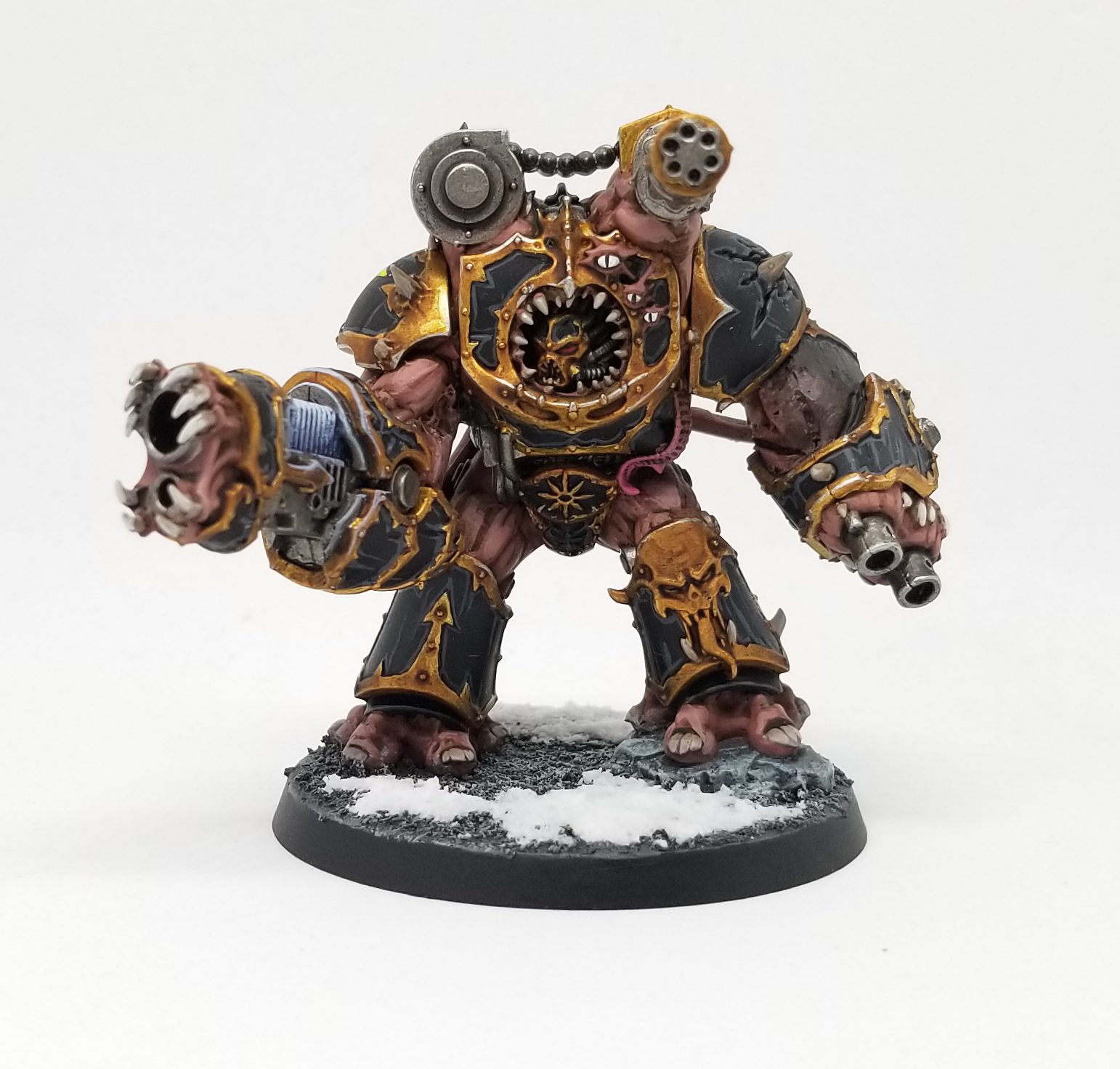 The other big model I had to get painted was a third Obliterator for my Black Legion squad. I've needed this for a while, but I didn't want him to look identical to one of the other two Shadowspear guys. So I decided to kitbash him with some left over parts from a plastic Chaos Helbrute. The guns are a little big and replace the fists entirely, but I think the look works pretty well overall. Smashing this guy took a lot of green stuff.