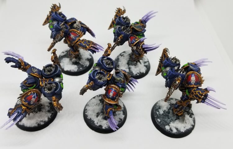 Since I was going to run my Chaos Slam Lord in my group’s game, I really wanted something to accompany him to help provide anti-overwatch. Warp Talons seemed like a perfect fit as I have eventual plans to expand with a Slaanesh daemons detachment which can provide some nice buffs to these guys. Plus they look super awesome. This is the first test model and I’m really happy with how the color scheme works out.