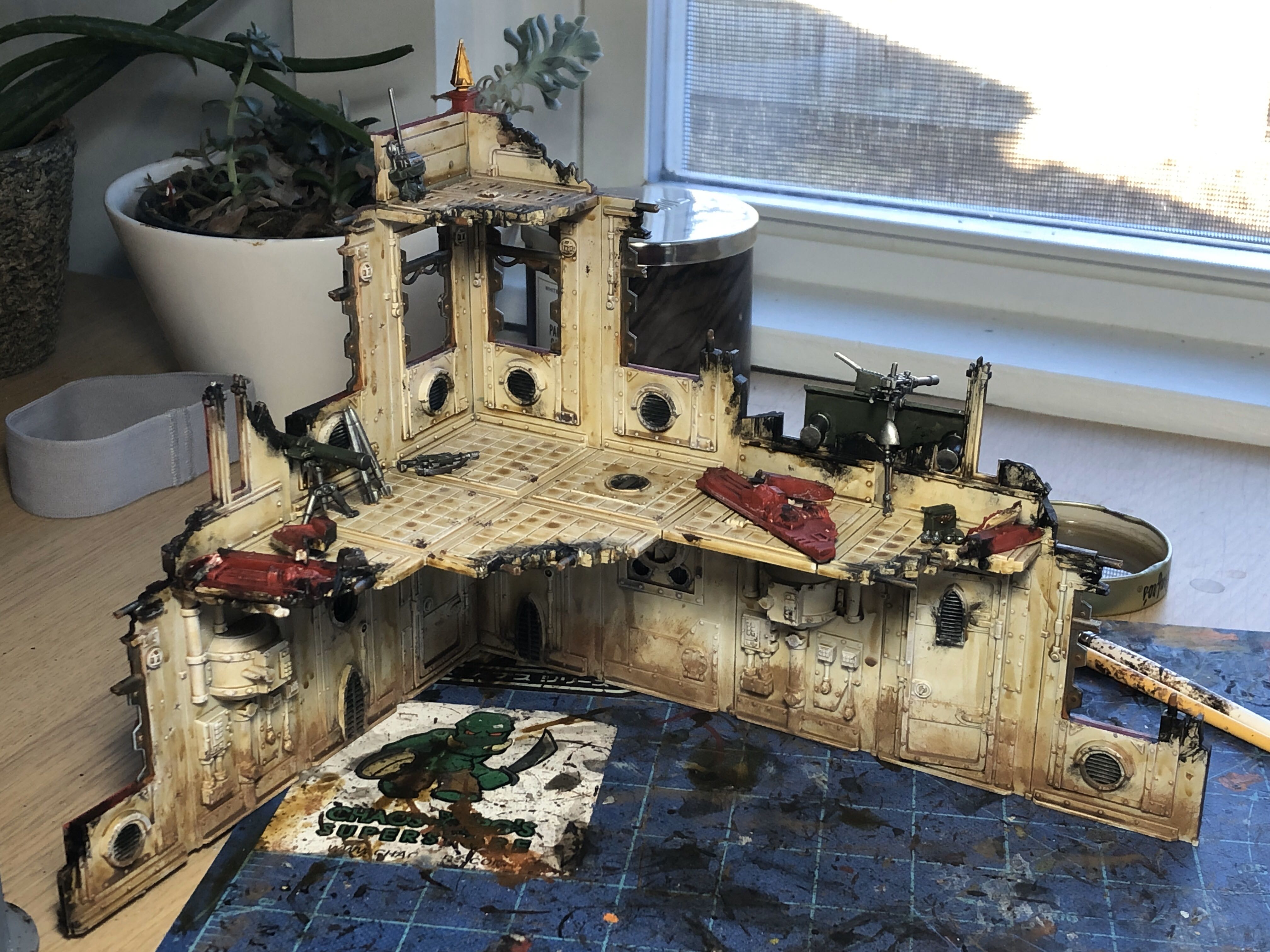 Dylan's place and we were going through some excess stuff of his. He had a Cities of Death ruin he built back in 2007 but never painted, and he handed it to me and said "it's your problem now". Using what remaining Cities of Death bits I had (and a bunch from my Imperial Guard bitz box) I put together a neat little ruin that tells the story of it being used as a Guard command post.