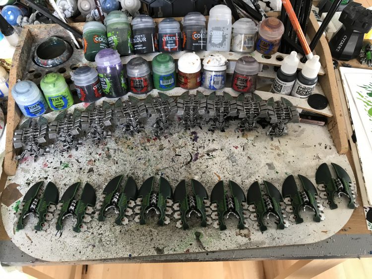 I'm also most of the way through doing the rest of the models. I do a simple Sautekh scheme, so the bulk of the time spent is just getting coverage on the multi-stage process to do the silver (not hard, just time consuming) and edge highlighting any vehicle bodywork, which I do as Caliban Green two-stage highlighted with Warpstone Glow and Moot Green.