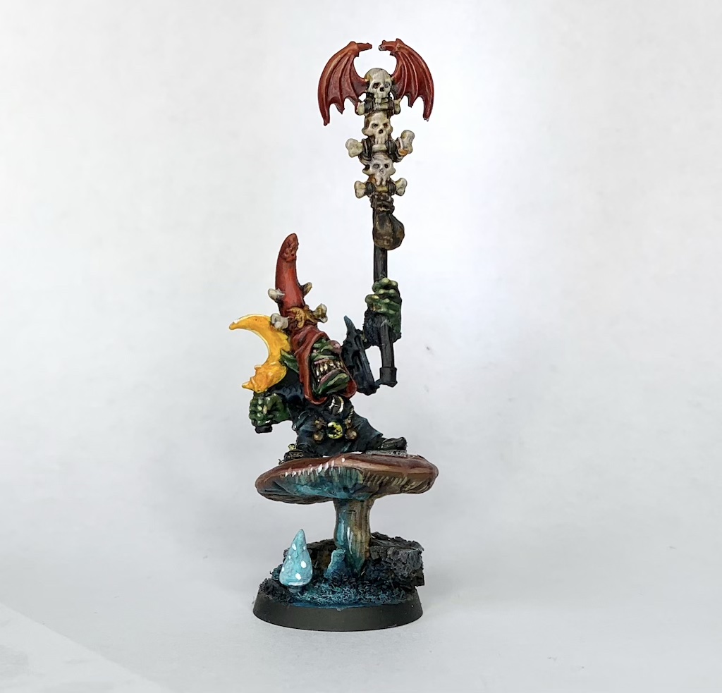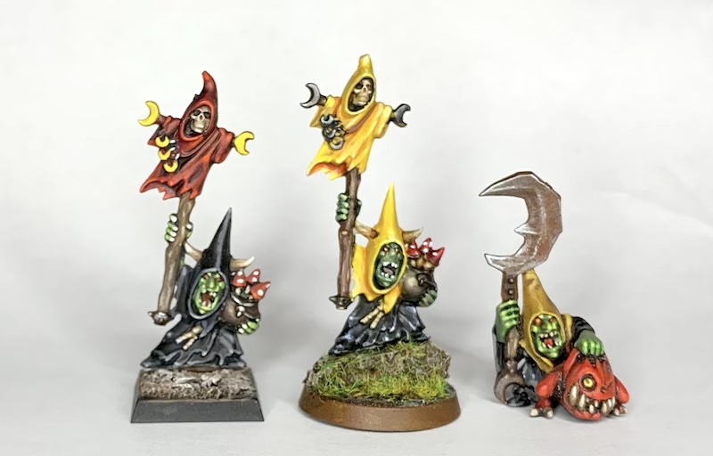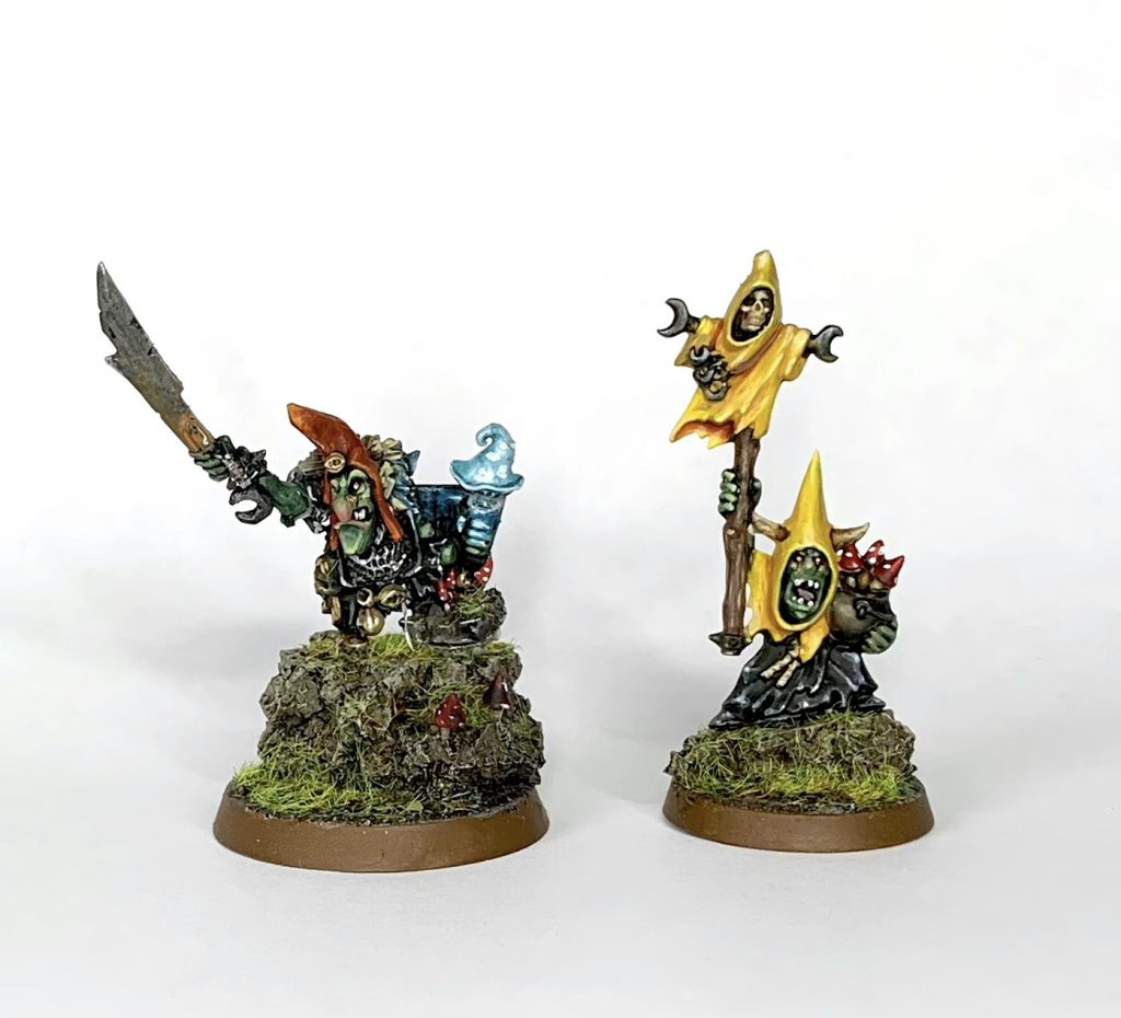 The left character is an old Night Goblin Warboss I found on eBay, he's supposed to have a shield but it was missing so I added a glowing mushroom to distract from its absence. The other Shaman next to him is the old Battle for Skull Pass one, that I ordered with the boss only to find the one I painted 15 years ago a few days later along with the cute little boss guy. The Shaman from eBay had a broken nose and missing top of the voodoo doll thing, I painted a nose on, and the hood isn't too bad in isolation. They'll both be rebased to fit in with the other guys.