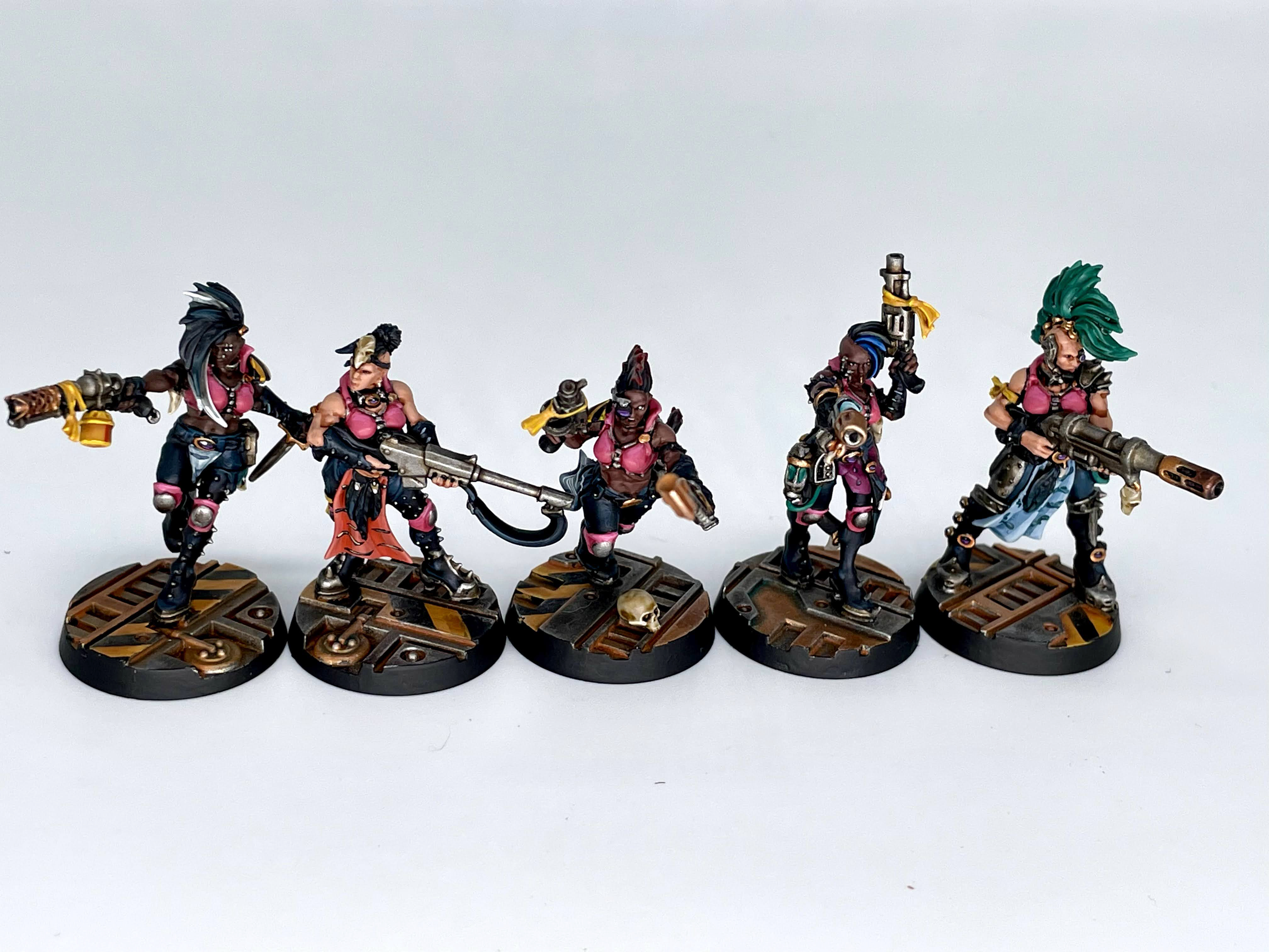 insisted that instead of a boring black rim her gangers be encircled in a ring of colorful metallic blue. This was an incredibly fun and challenging model to paint, and I'm excited to do more with her.