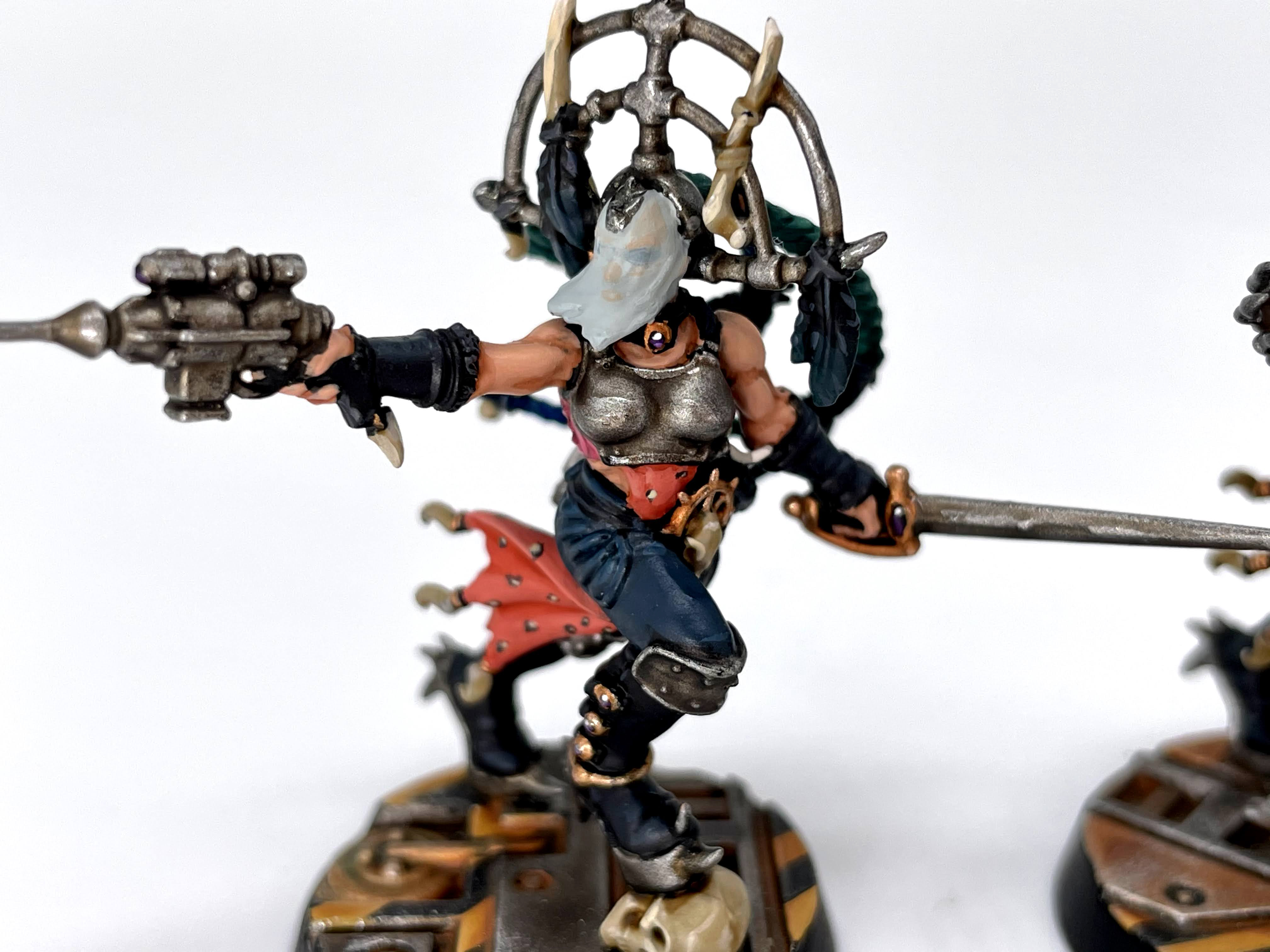 I went for broke and decided to do the translucent veil effect on the left Death Maiden. At first I was a little concerned with how I'd pull it off, but figured it would work the same as any other specular highlight. So, working from the basecoat of Celestra Grey, I mixed in progressively more Cadian Fleshtone in 2 or 3 thin layers to build up the effect. I wrapped it up by mixing in a little Dark Reaper and hitting up the eye sockets.