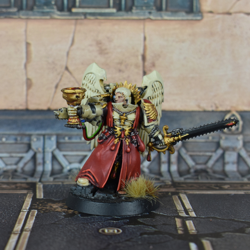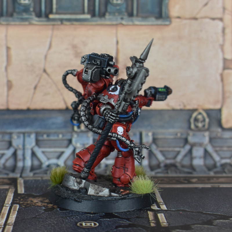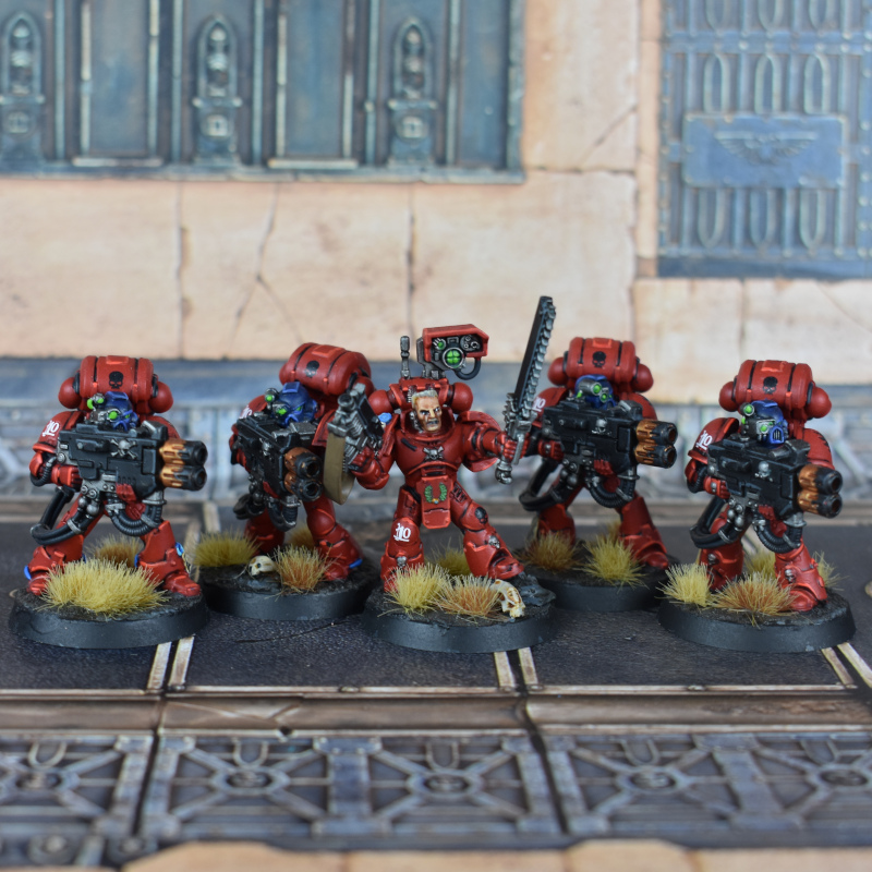 Some more Blood Angels, including melta Devastators, a Sanguinary Priest with jump pack, and a Judiciar - I swapped the head on this guy to be hooded instead of the default skull thing.