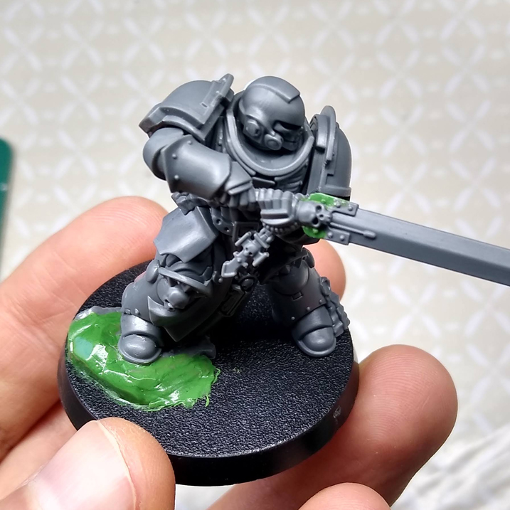 Now, on to my next mostly-black-and-white character: a counts-as Judiciar I kitbashed from the events-only Primaris Champion and a Reiver head, plus some greenstuff to Romanize the sword hilt.