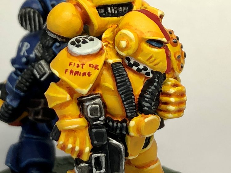 The caption running all the way around says "He Who Stands With Me Shall Be My Brother", and I painted an Imperial Fist and Ultramarine - his and my favorite chapters, respectively.