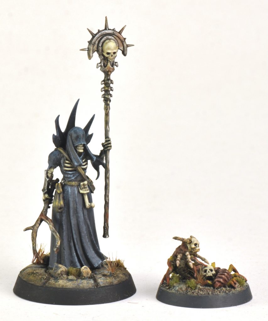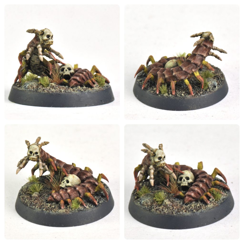 The other project was a necromantic remnant for Necropolis. This was built out of a small skull bit off a Tomb King standard, some little finger boney bits off Bonereapers Arch-Kavalos, Dryad fingers, and greenstuff for the centipede body.