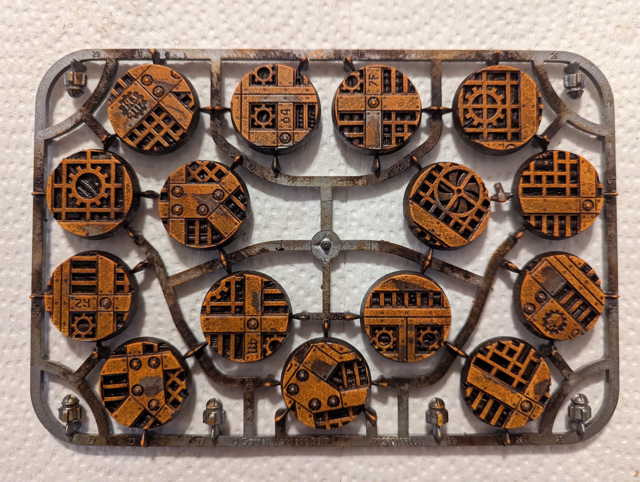 Weathered bases made using metallic spray paint, Rub n' Buff, craft paint, and water mixable oil paints. Credit: Kevin Genson