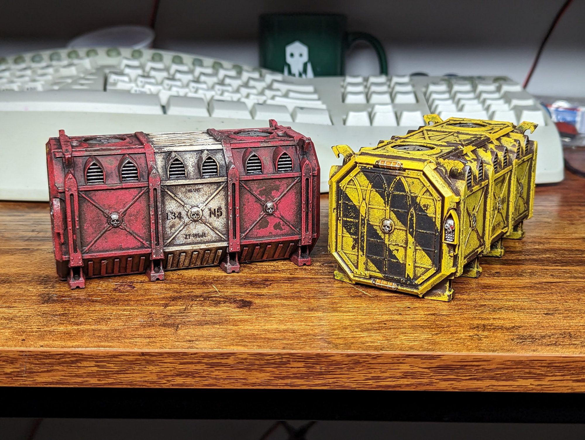 Somehow the #hobbystreak continues unabated, with this month mostly focused on crates. First up I finished up the Battletech starter set. It's been fun working with wax based metallics in something other than terrain. The red is Blood Angel Contrast, while the copper is Rub n' Buff Spanish Copper with an application of Gloss Nuln Oil for shading. The blue terrain is Vallejo Black Lava texture paint primed white, hit with a 50% thinned layer of Space Wolves Grey Contrast, a drybrush of Vallejo Game Color Electric Blue, and a final drybrush of white. It's pretty nice and I might use it on other projects if I want an alien ice effect.