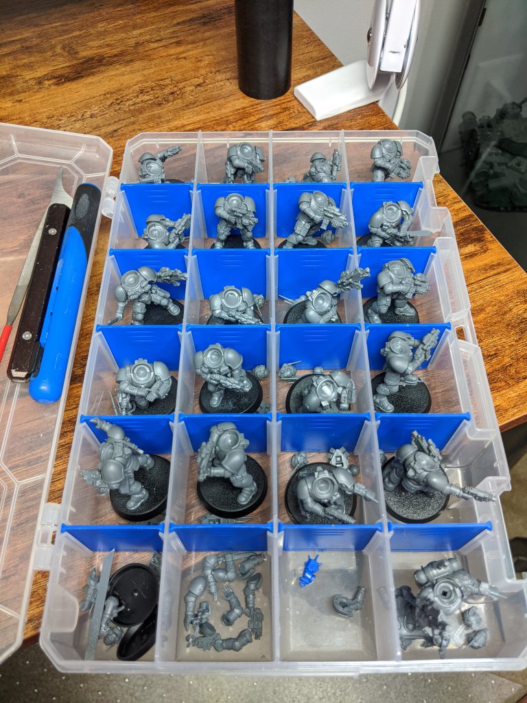 This has been the bulk of the work for me; cleaning up and modeling 20 Intercessors and a Phobos Captain so that every one of them is posed differently and has a helmet. That meant getting creative with the Shadowspear units since 6 of them are identical, but the judicious use of the Infiltrator and Reiver sprues allowed me to keep all of them unique. Hopefully the humidity will break at some point and I can get them primed and ready for paint.
