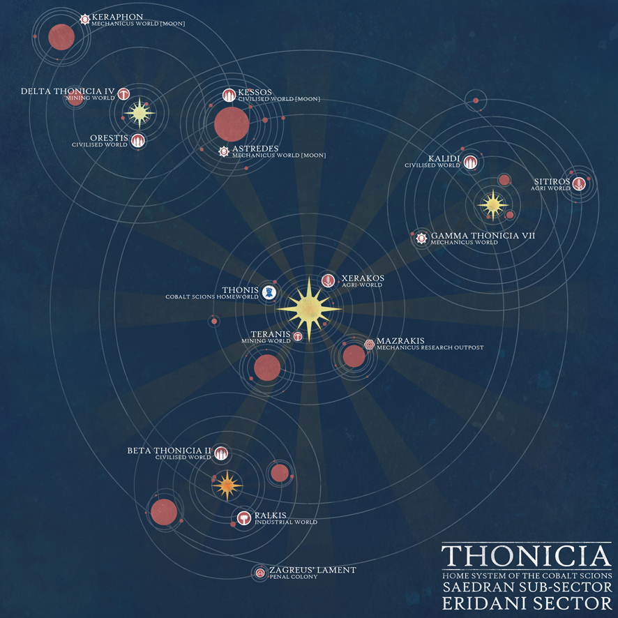 That's the two sector maps next to each other so you can see how the background art I made lines up. Because that clearly wasn't enough Photoshop action for one month, I also made a diagram/map of the Cobalt Scions' home system. Credit where credit's due; in this second map, the icons for the inhabited planets are recoloured versions of the 40K map icons made by the Mighty Goat Man over on Reddit.
