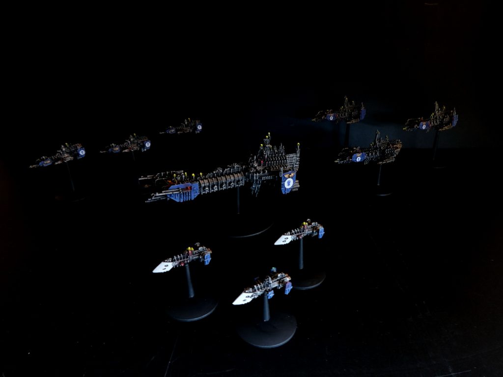 A side effect of writing all this stuff about BFG was the irrepressible urge to paint some tiny ships, so I strapped on my spelunking gear, waded into the Cairn of Opportunity under the stairs in my house, and pulled out 1,200 points of Astartes ships. And painted them in a single afternoon/evening. I'd almost forgotten how quickly BFG stuff paints up. Err... well, if you're drybrushing. Which I was.
