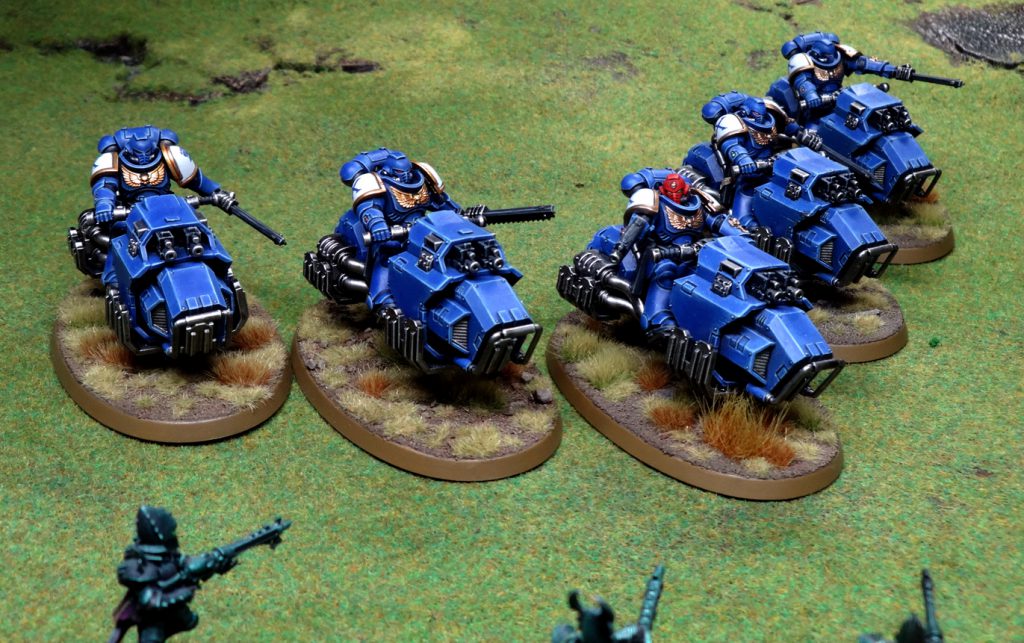 For my marines, I added two more grav bikes so they can fly around in a giant V formation, which is at least as important as butchering the enemies of Mankind. I also painted up a Hammerfall Bunker, and made some adjustments to the turret so that I can pop it on the top of a Gladiator chassis for use as a grav-Whirlwind. Again, you can see how that looks