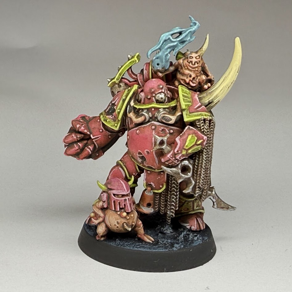 First of all, I finished a test model for a Death Guard army. I've always wanted to do some in a bright pink and green scheme, but was at a bit of a loss for how to do it efficiently. My solution is to base with Convict Orange spray from Colour Forge, before a zenithal of Rogue Pink. This spray can solution does a lot of the work. From there it's some basecoats on the trim and other bits, gloss varnish, streaking grime, matt varnish, and honestly that's mostly it. I've done some highlights for the extra pop.