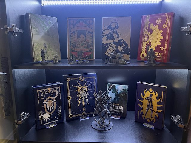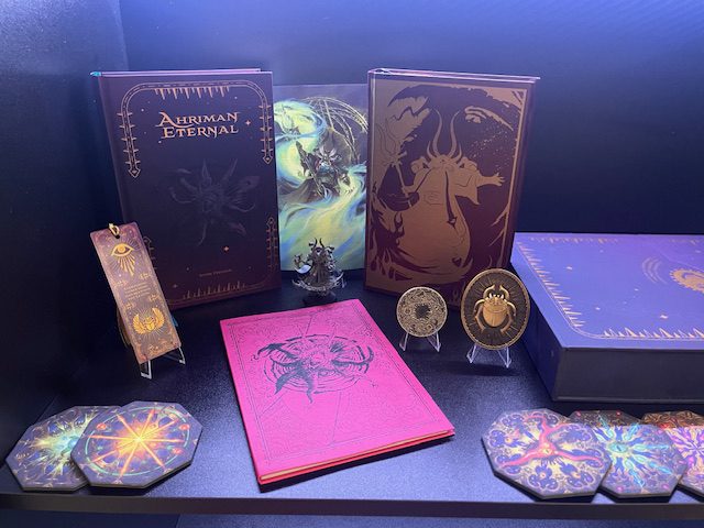 Here's a closer look at the Ahriman shelf, including the coins, tarot cards, and bookmark from the Ahriman: Eternal Limited Edition box.