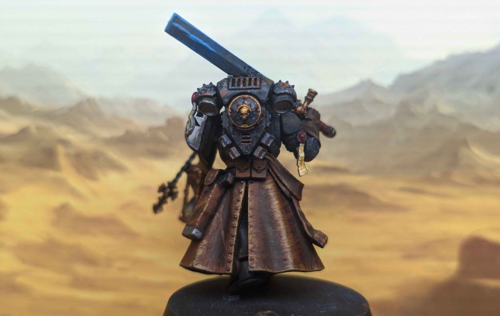 I've nearly entirely switched to Pro Acryl for my paints and the coat leather was a good way to finally utilise all the warm-browns I've collected.Ā It's a simple effect of scratchy, layered highlights moving into ochre and then glazed back down with a red-brown. (in my case, Reikland Fleshshade for it's semi-gloss finish to contrast against Pro Acryls matte finish)Ā It immediately pops and looks great on the table, which is exactly where he was next day leading me to a decisive victory against some Custodes.