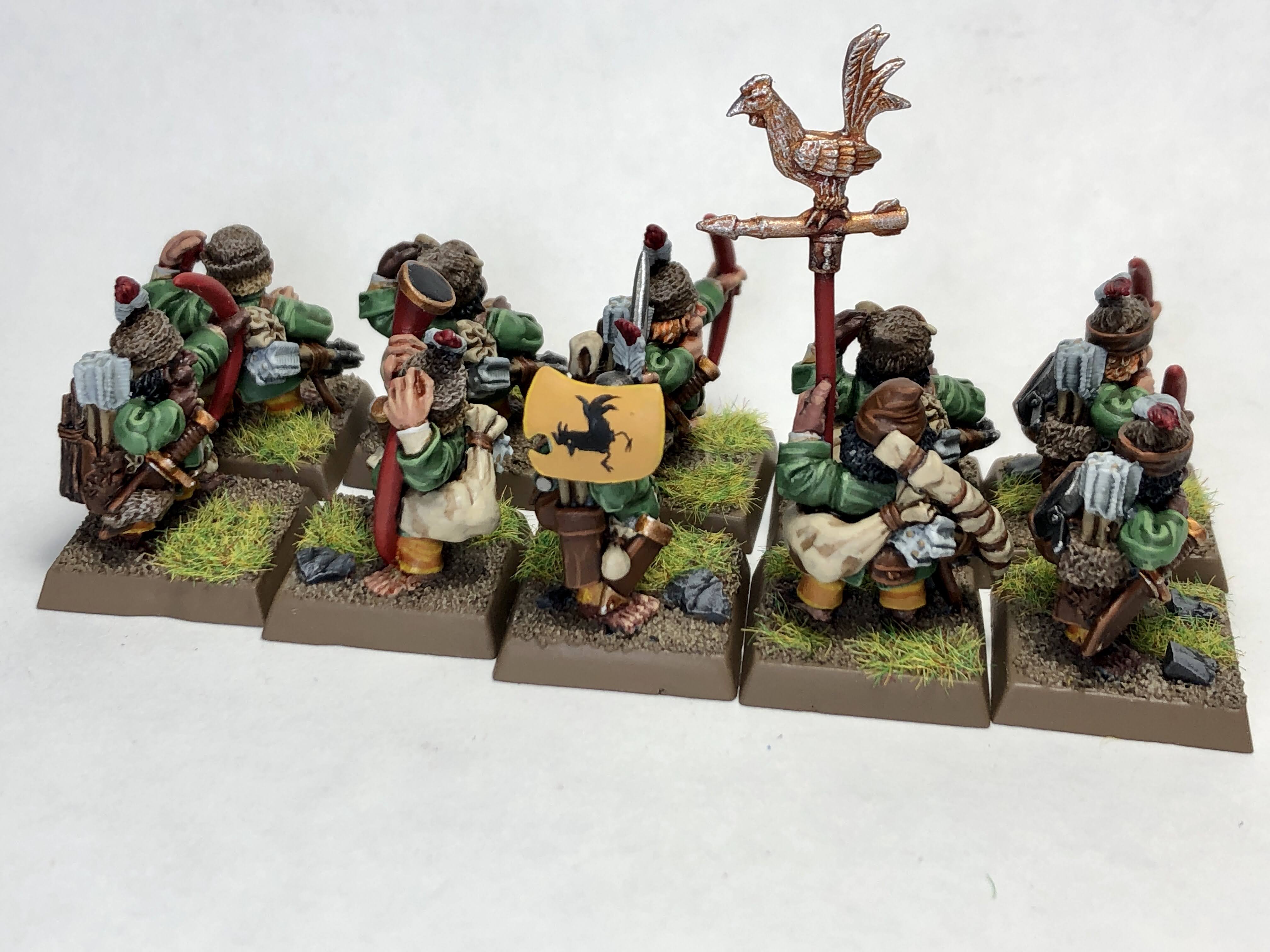 I had finished the base model months ago, drawn to the gatling gun's clarion call of BRRRRTTTT, but any opportunity for more stupid freehand designs is one I'm happy to take. From here I pivoted hard into my love of Warhammer Fantasy. The dark thirst I had to paint some halflings had to be sated, so I bought and painted Lumpin Croop's Fighting Cocks, an old Regiment of Renown: