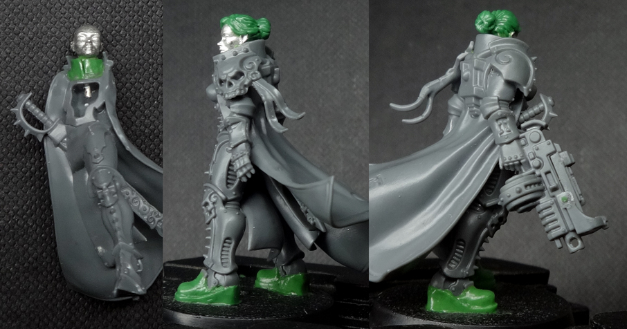 Yeah... the volume's still at eleven. Ah well. The basing is ultra-basic; it needed to fit with my other Inquisition stuff, the bases of which are mostly designed to fade into the tables they generally get used on. In case you're curious, there's a photo of the conversion work below. Bonus points if you can spot the two rivets I sculpted. The head is from Statuesque Miniatures. I tried sculpting boots more like sabatons initially, but my mediocre sculpting skills couldn't get those hard edges to be even remotely symmetrical across the two feet, so I had to go way more plain, sculpting them more like rubberised boots that'd have steel toecaps under the flexible outer layer. After some debate I went for wedge heels over flats - definitely an impractical move - because the character is an extremely snooty noble who would 100% jump on the chance to look down on someone via mechanical advantage. At least now she won't be stabbing the floor.
