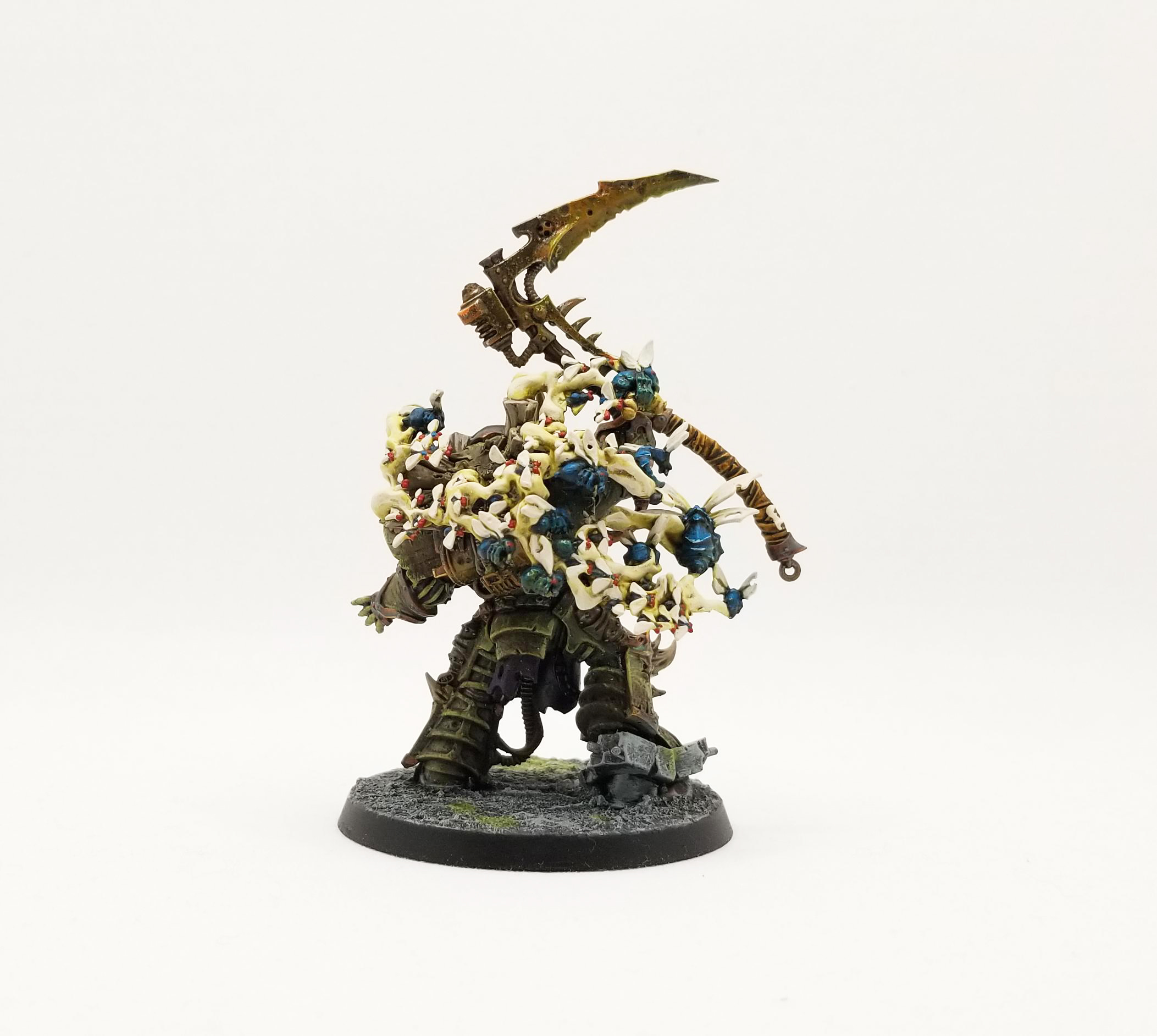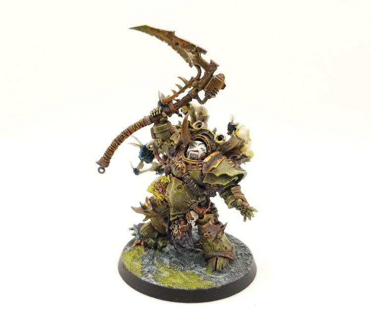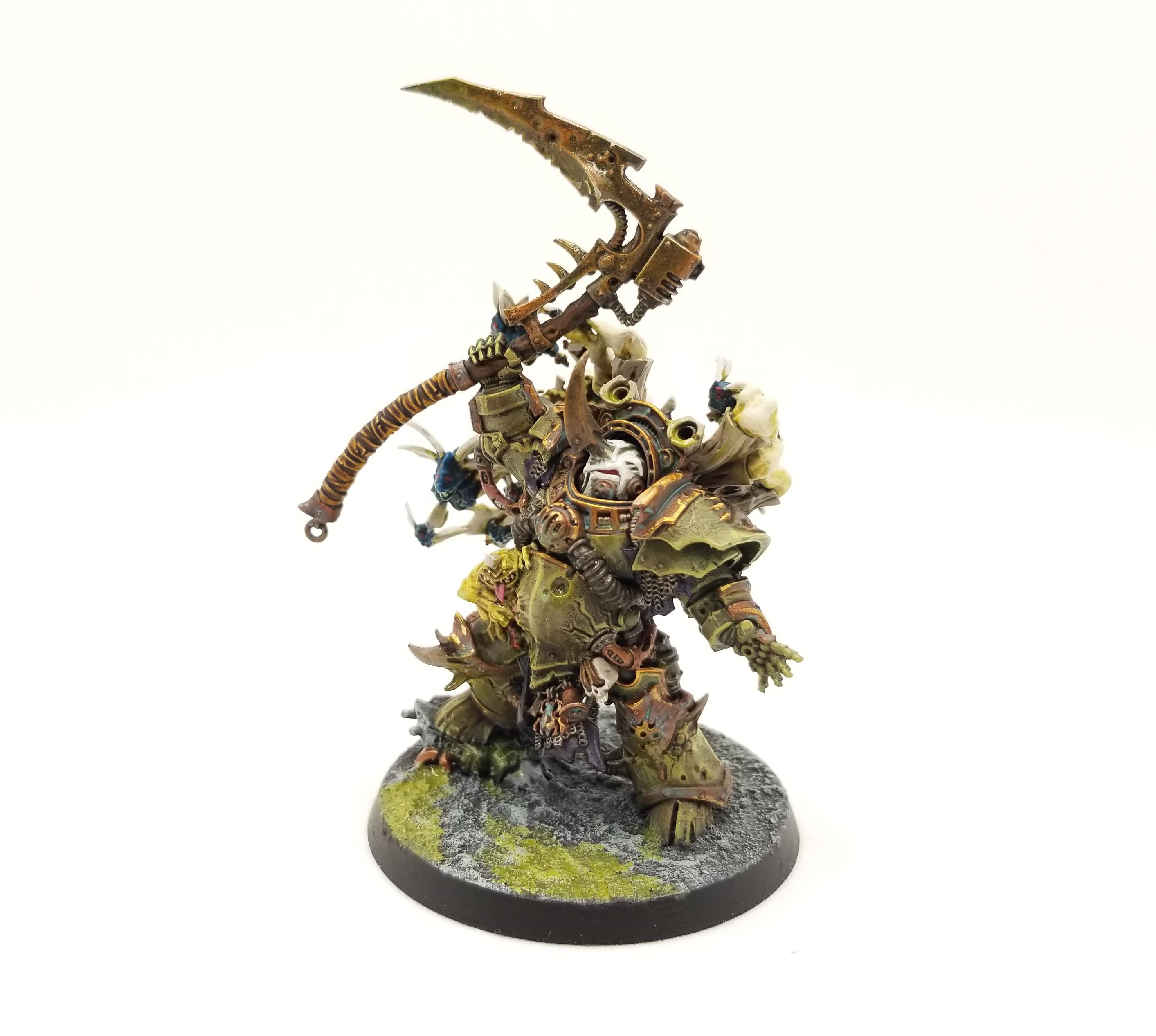 Still on my Death Guard bullshit, at least for now. The latest addition to the army is Typhus! I'm really happy with how he turned out, in part because the 'Eavy Metal version looks so cartoonish, with the mishmash of bright colors and shades. Next up after Typhus is the new Fabius Bile, then back to some more Death Guard.