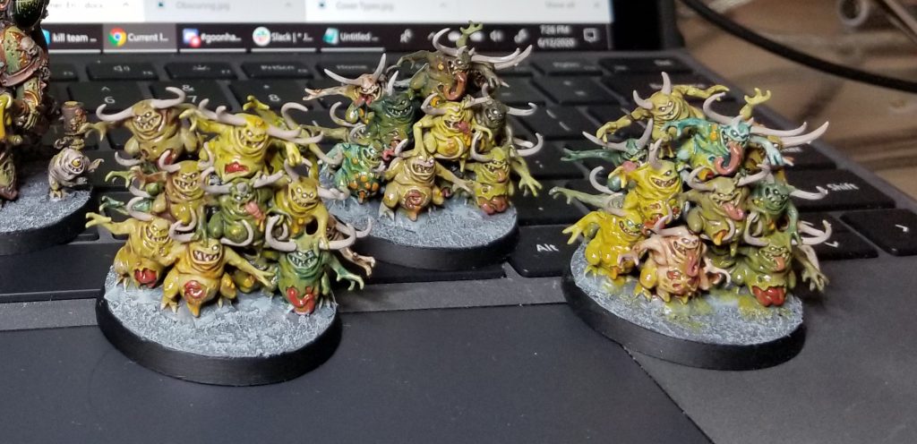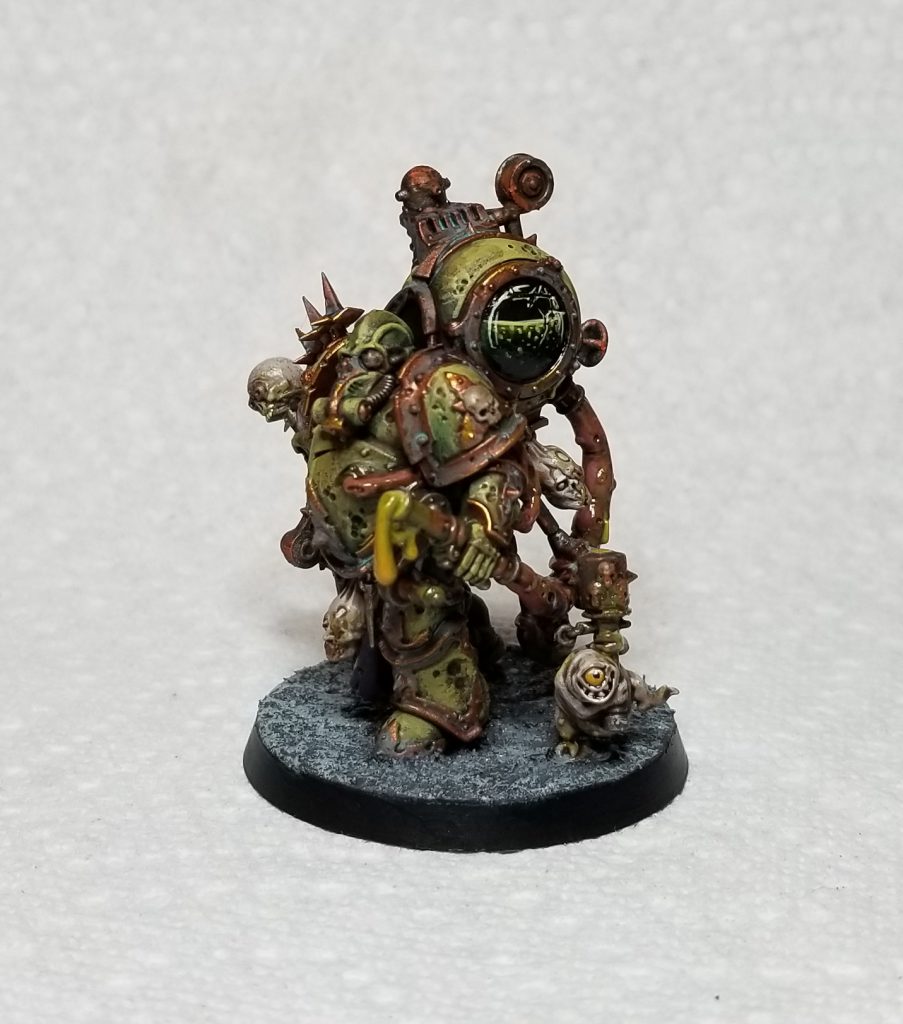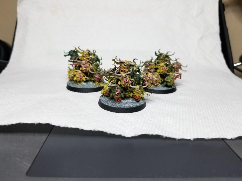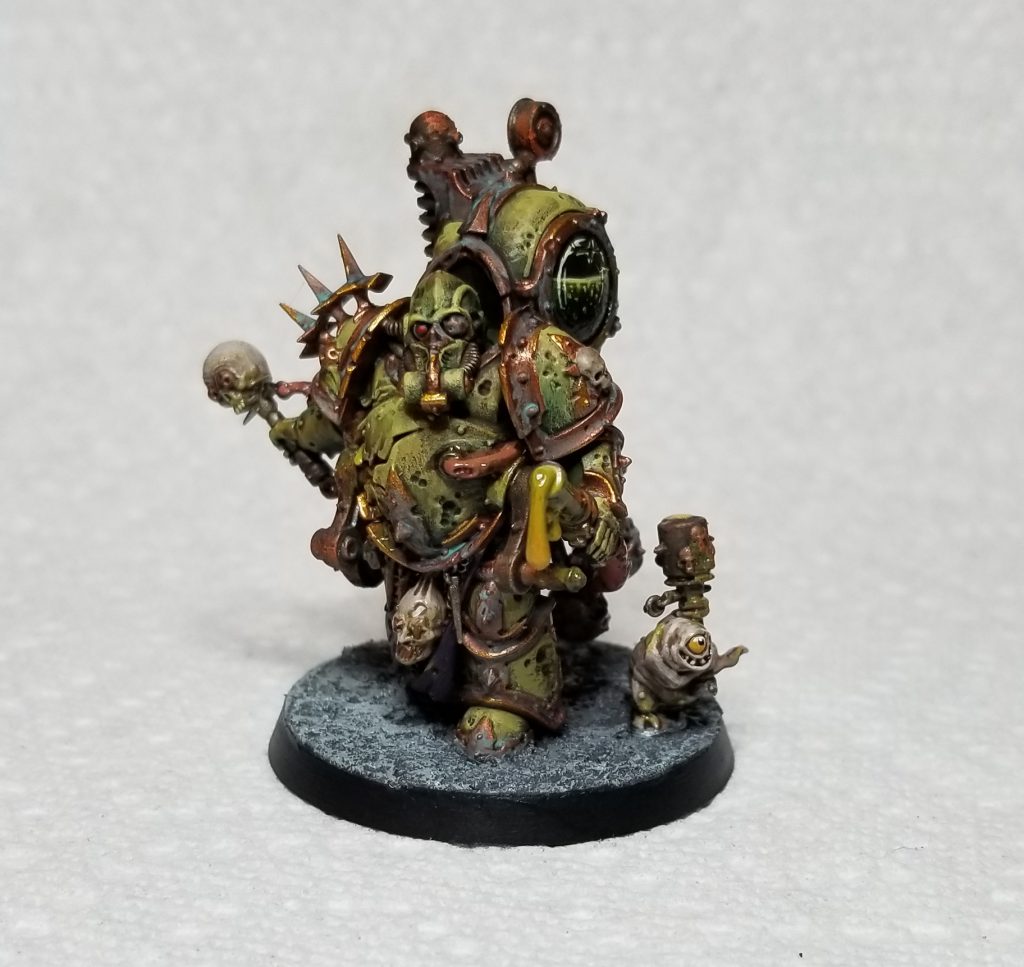 I'm still painting up my Death Guard, hoping for when they're beefed up by the upcoming rules in War of the Spider. I've been planning on adding a Chaos Daemons detachment to them, and so in the last two weeks I've added a Foul Blightspawn and two squads of Nurglings to my group of merry blighters. Next up: Typhus.