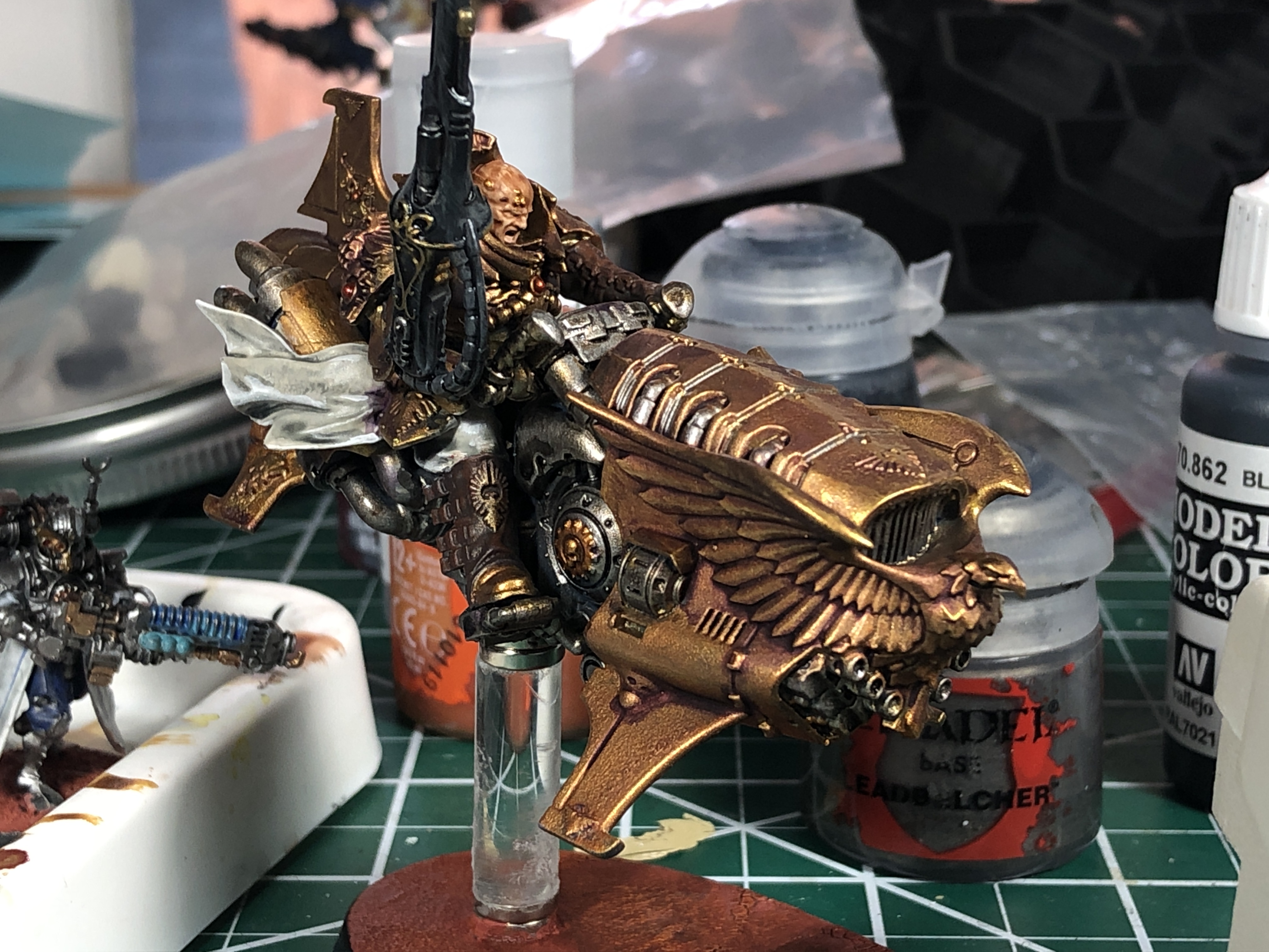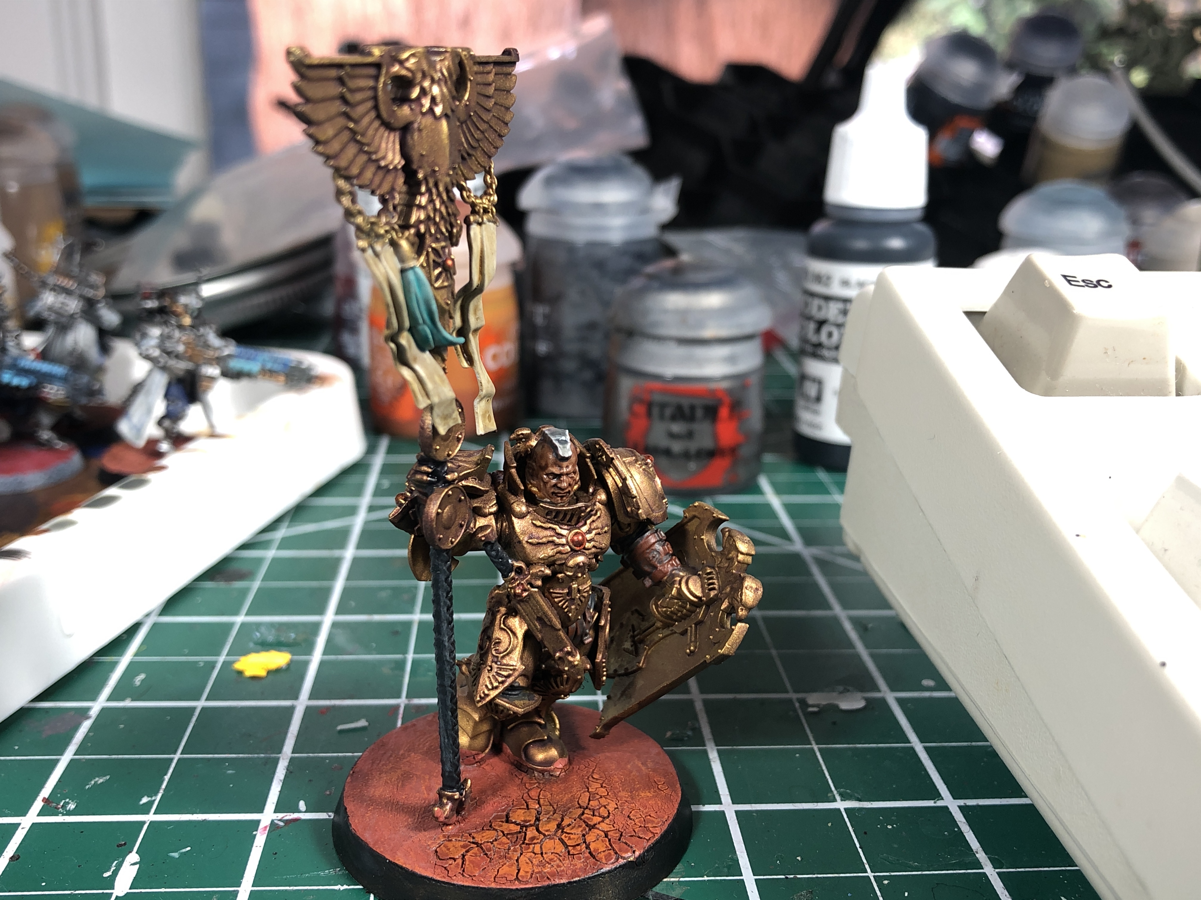 The past two weeks have been busy with moving prep for me, but while packing I found one model I had misplaced and was hiding behind a couple boxes - a Primaris Chaplain. I figured I had to honor this forgotten soldier, and I wanted to try out a new distressed leather painting technique.