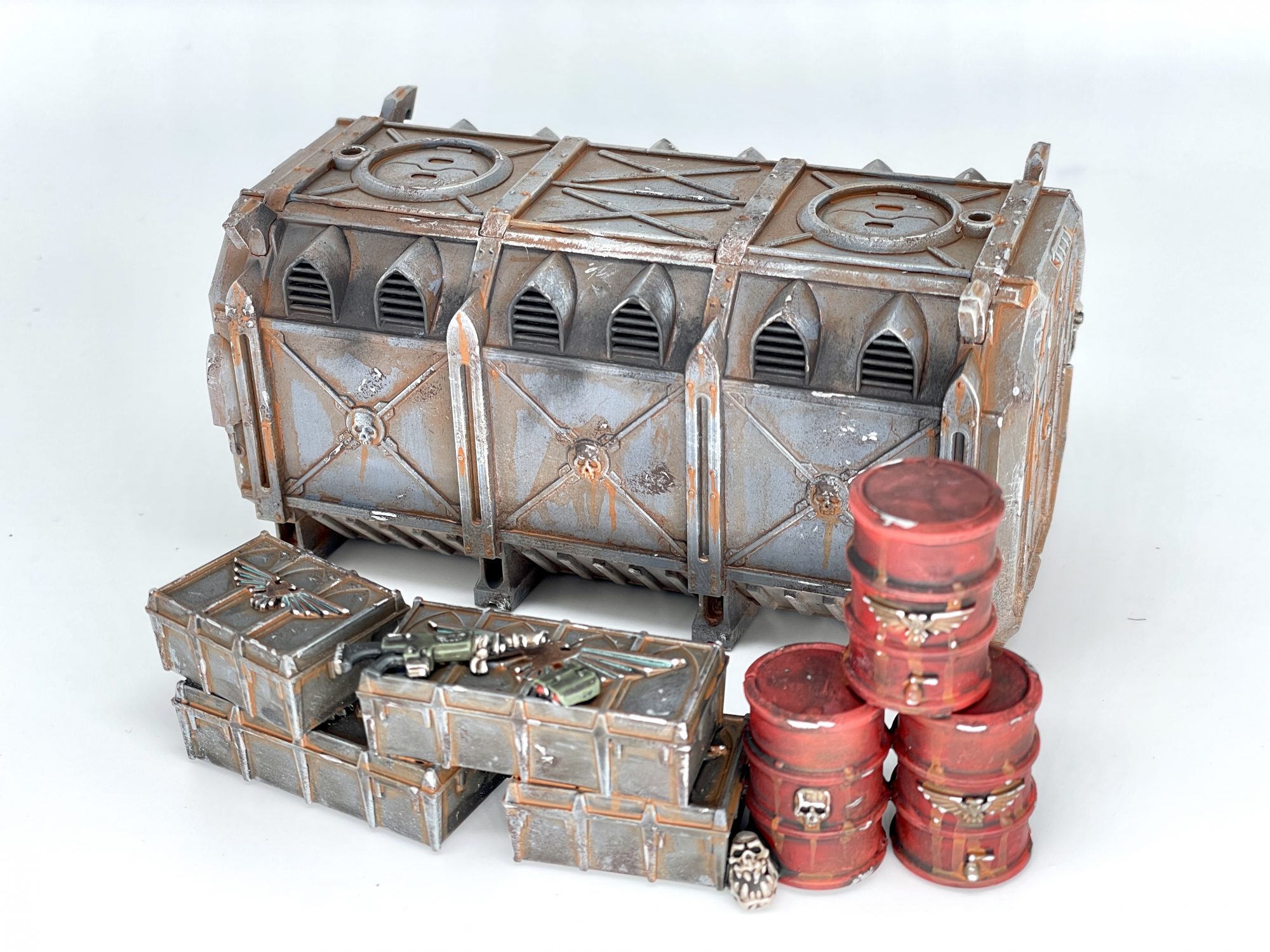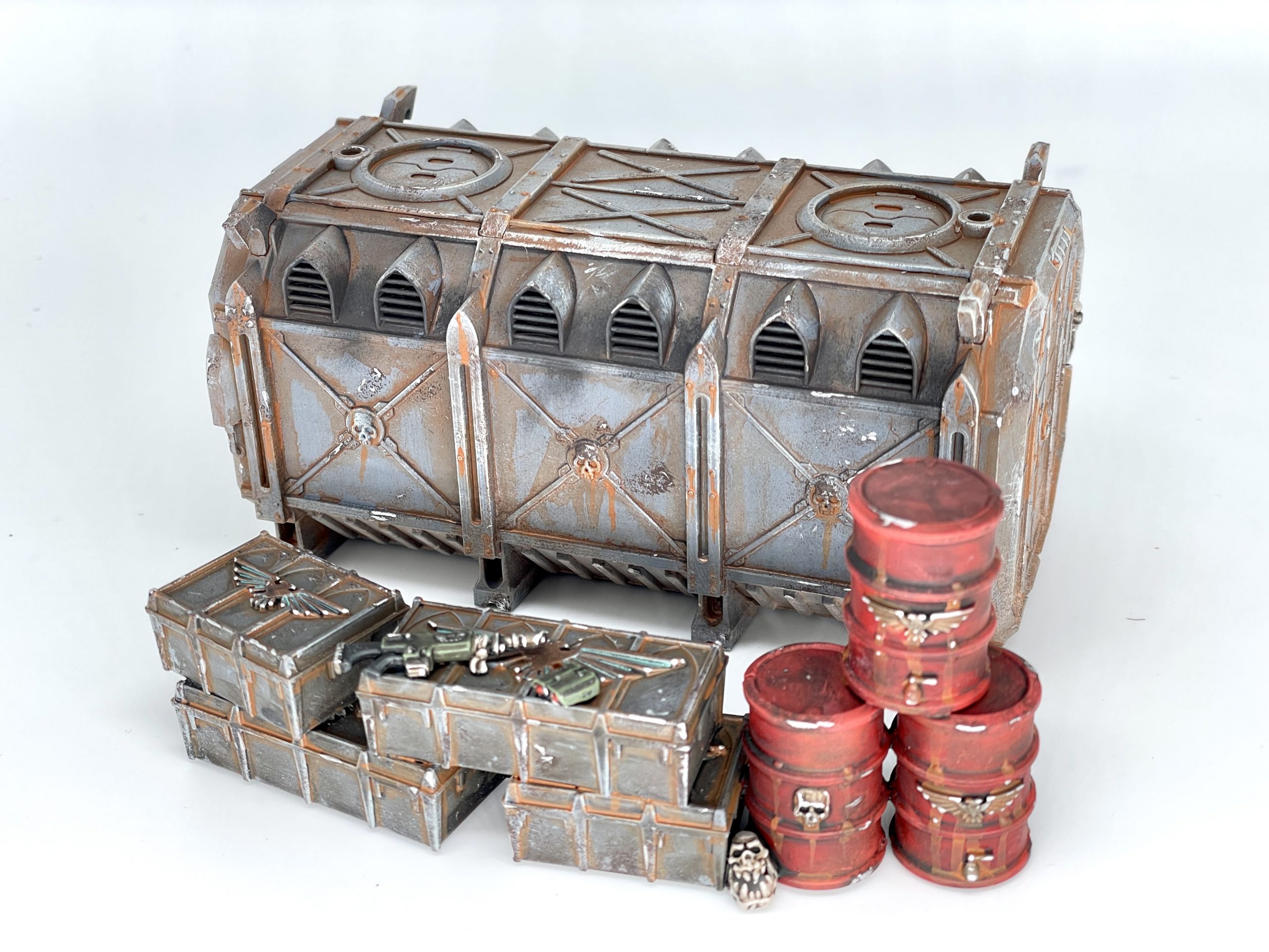 Lastly, we've got a smidge of terrain. I've painted a lot of black power armor this year - Templars are all I've painted since March - and I needed a palate cleanser. I had recently acquired a single Munitorum Armored Container sprue from Imperium, and thought it would be an easy project to knock out. I fished around my bitz box for some Guard accessories to stack on the boxes, made a little barricade with a structural Ork skull, and primed everything grey. I started washing right over the primer and knocked the whole kit out in like 3 hours over two evenings. After spending like 2 weeks painting a squad of dudes, getting to knock a few models out quickly is hugely gratifying. Naturally I've bit myself in the ass here as my next month is looking like some edge highlighting-heavy models, so we'll see if next month is half as prolific as this one!