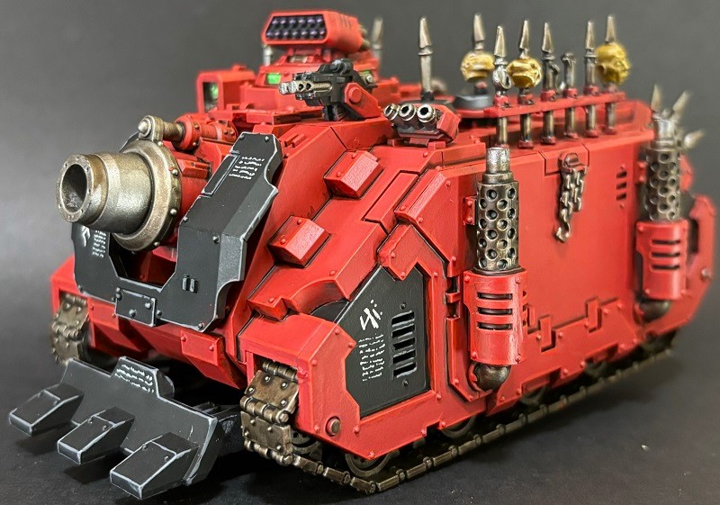 Finally, something that's not technically a daemon but it sure will be as soon as the game starts. While I'm a fan of the 40k-era Vindicator for the dozer shield, the 30k model is just so much nicer in most other ways. I chaos'd it up appropriately by adding some old vehicle spikes, shoulder racks off a spare Terminator Lord, and some War Dog bitz.